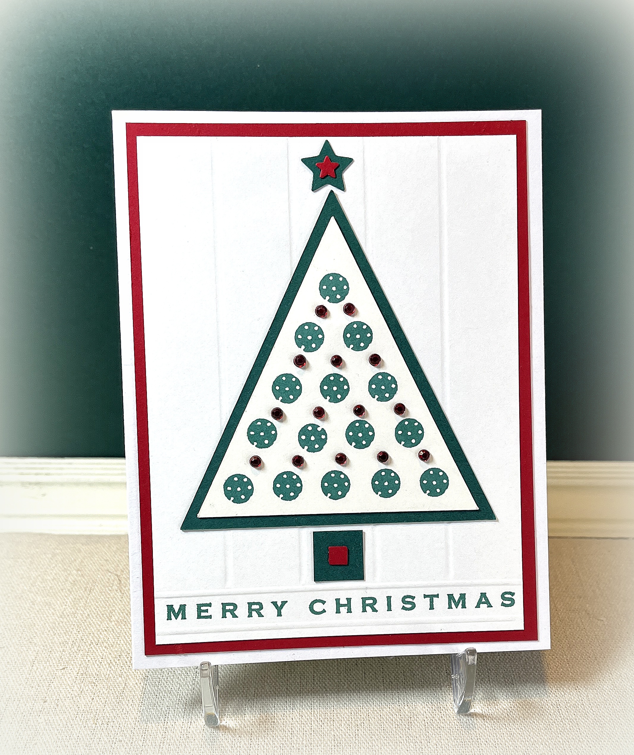 This card is kind of “a blast from the past” in that I had used this tree idea for a tag project back in 2014. At that time, I thought I’d create a pile of these trees and make them into more “mail friendly” cards. I got as far as stamping all the circles and attaching the gems on the triangles, and then I misplaced/forgot about them. After searching high and low, I found them last year, (misplaced them again, eventually found them!) and finally finished the cards. Why am I telling you this? Because, with all the the time that passed, I forgot/didn’t realize I had used an off-white card stock for the trees until AFTER I hand scored and stamped all the background panels and card bases on white and began to assemble all the cards! Sigh…