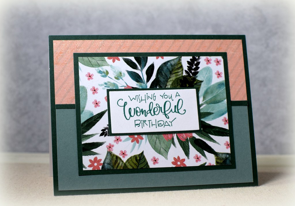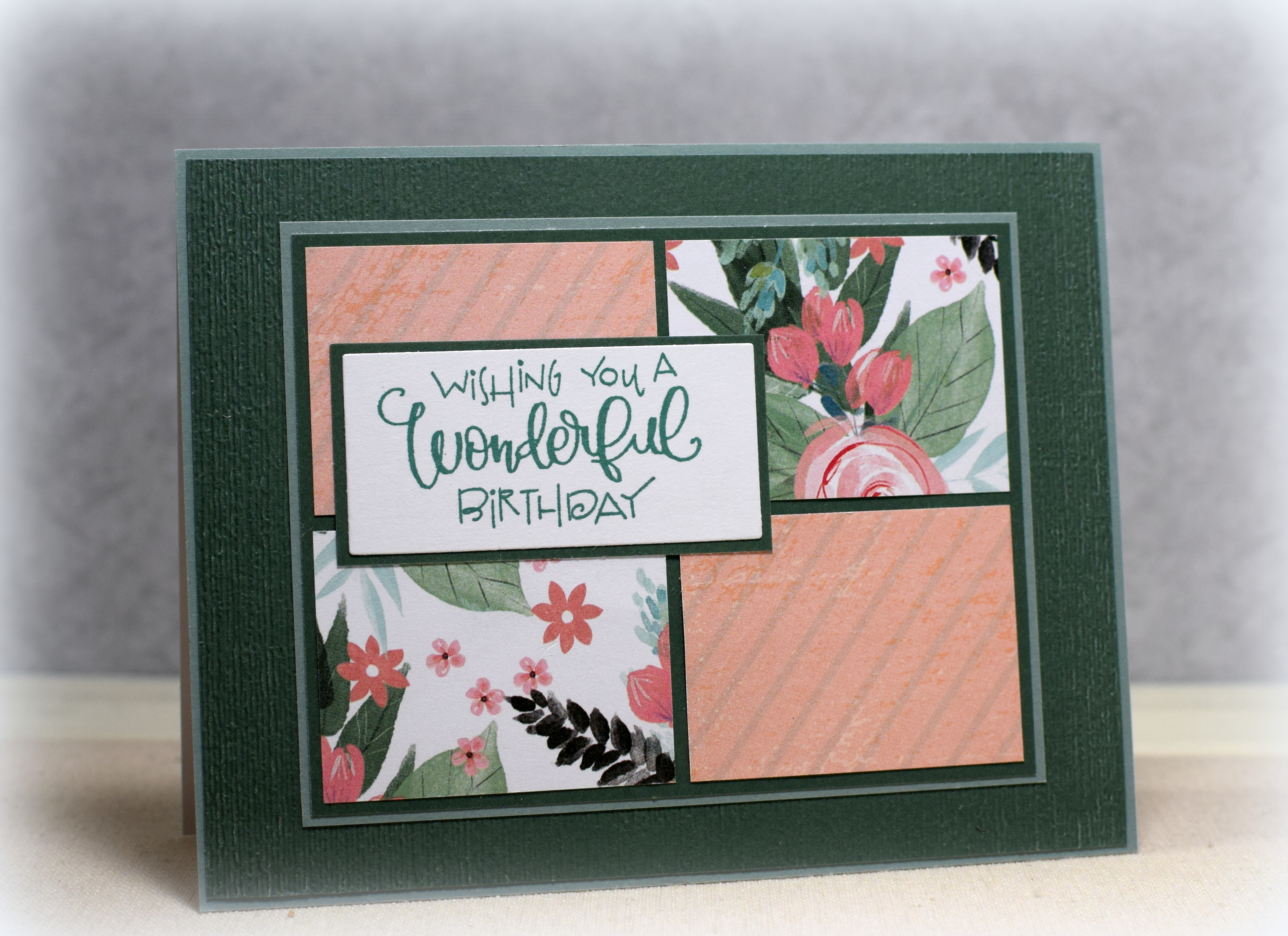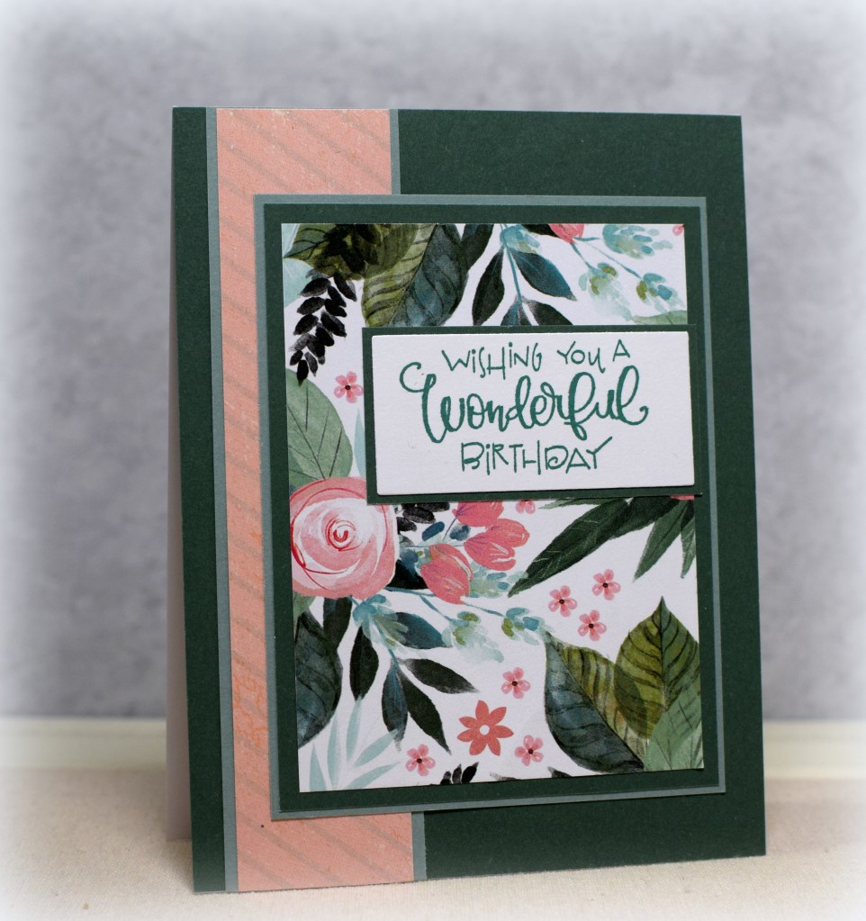 The focal paper I used for all the “One Sheet Wonder” cards is called “Floral Clusters & Leaves” by The Paper Studio. This OSW template works best with double sided paper as a few of the sketches call for flipping some of the pieces over after the sheet is all cut up, but this paper is one sided so I had to “cheat” and use a second coordinating pattern I had in my stash. (The peach strip above should have been the back of one of the pieces cut from my patterned paper.)