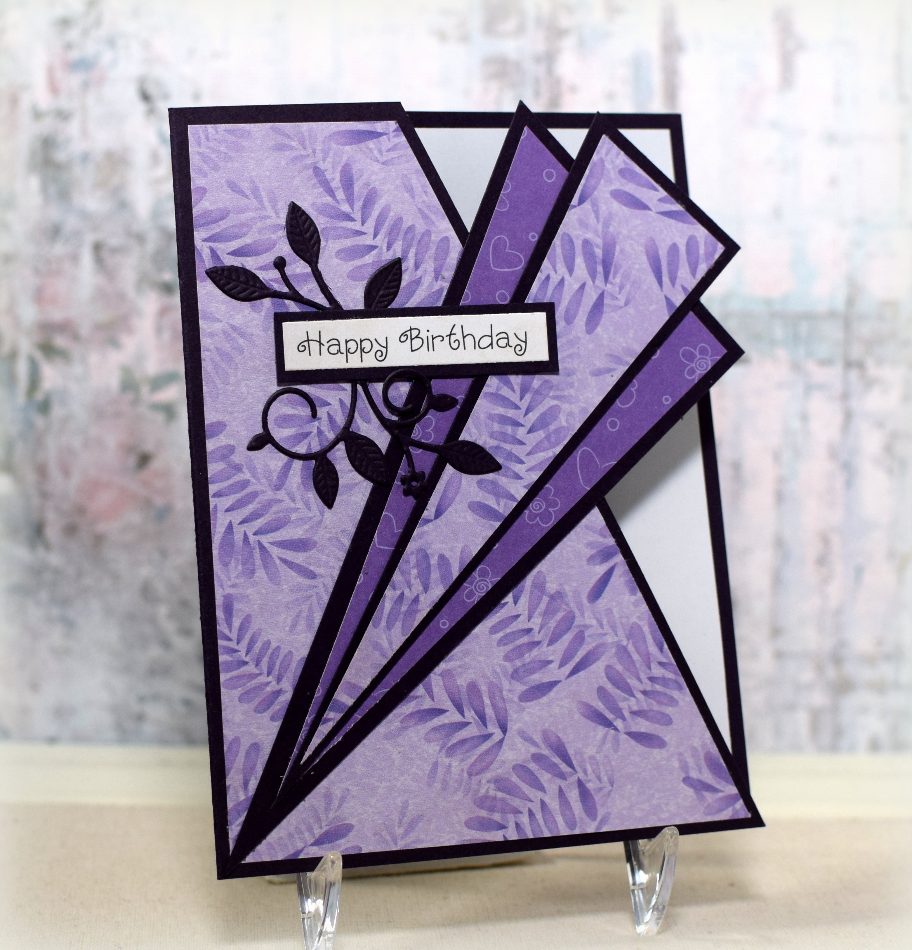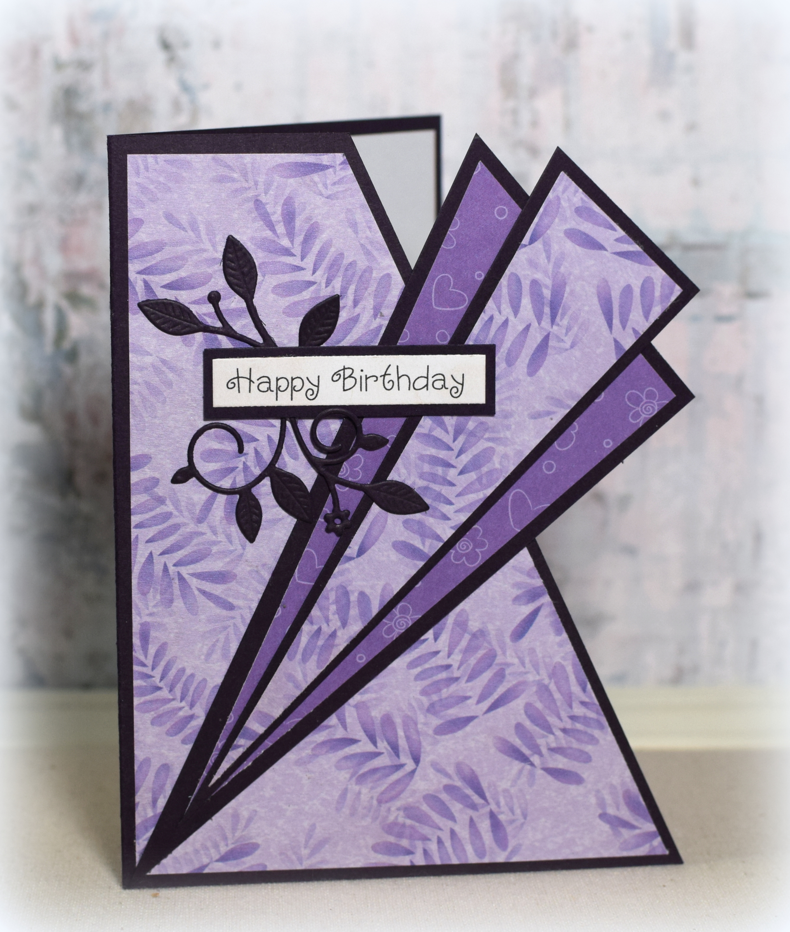 I recently cleaned/reorganized my craft room and discovered LOTS of (probably discontinued by now?) paper that I forgot I had or couldn’t get to easily enough to bother with. Hmmm… maybe I never have to buy another piece of paper again???… Anyway, it was fun “shopping my stash,” and I came up with two prints for my fan card. The lighter print is “Soft Purple Ferns” from Hot Off the Press/Paper Pizzazz, and the darker one is “Fairy Tale” from Recollections. The solid card stock is “Edible Eggplant” (not black!!) from Gina K Designs (no longer available?).