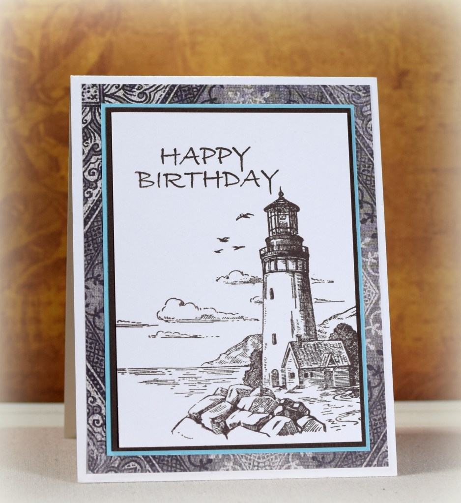 This card features a stamp from the Idyllic Floral Scenes series called “Lighthouse” (#IFS040) by Nellie Snellen and a greeting from GKD’s Birthday Blessings (retired?) both stamped in GKD Chocolate Truffle amalgam ink on Recollections White Dove card stock. I matted the stamped images with GKD Chocolate Truffle and Sea Glass card stock and then with a sheet from The Paper Studio’s Dalmuti paper pad.