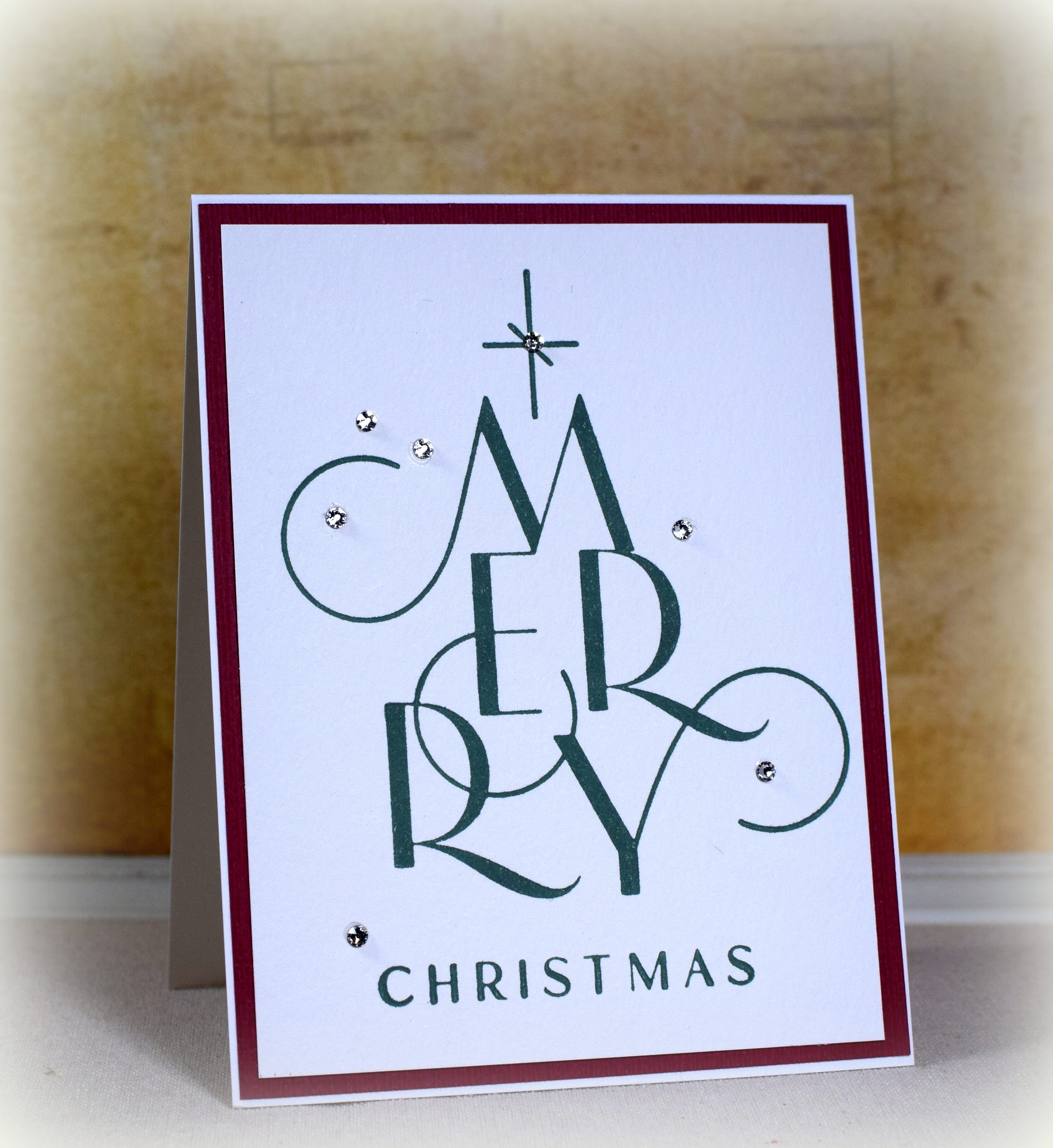 This simple card features the BetterPress “Chic Merry Christmas” press plate from Spellbinders and some 3mm crystals from Stamplistic. The stamped image is pressed into the cotton paper (instead of just sitting on top).