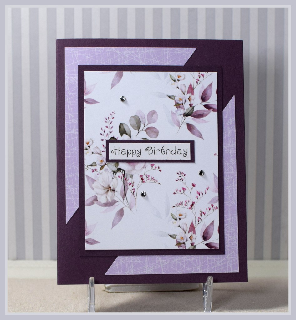 The patterned paper I used is Recollections “Lavender Lines” and a piece from the “Floral Meadows” paper pad from Brass & Bliss. The base and mats are from the Recollections “Passion Fruit” cardstock pack (no longer available?).