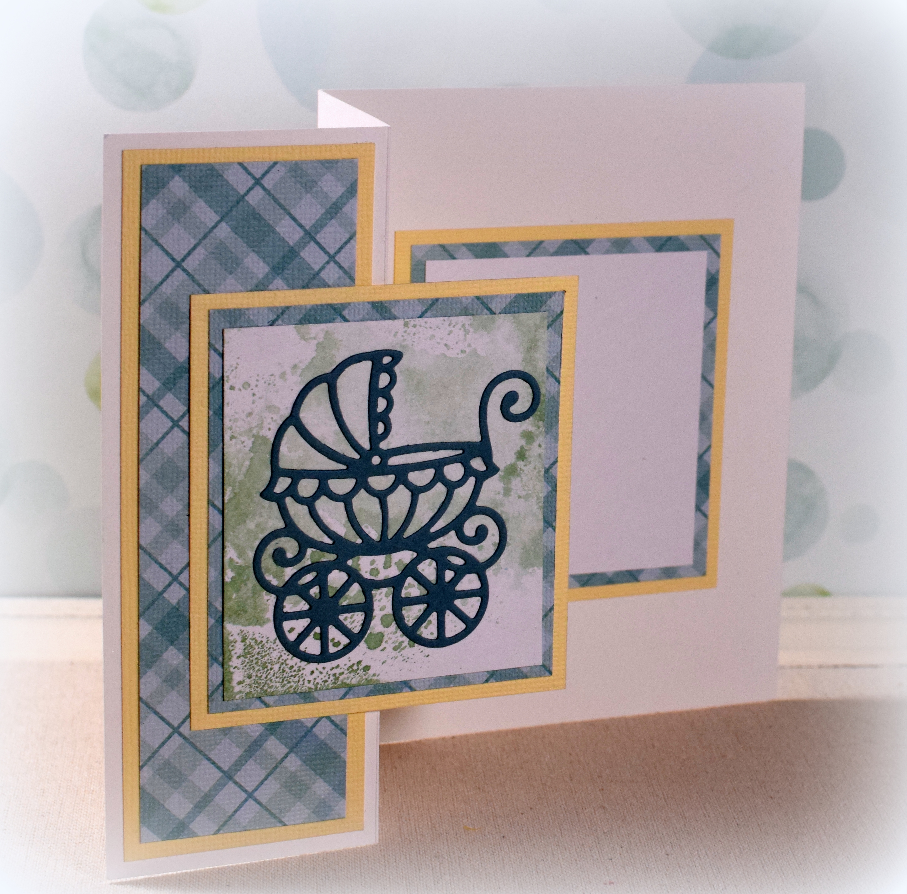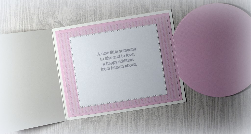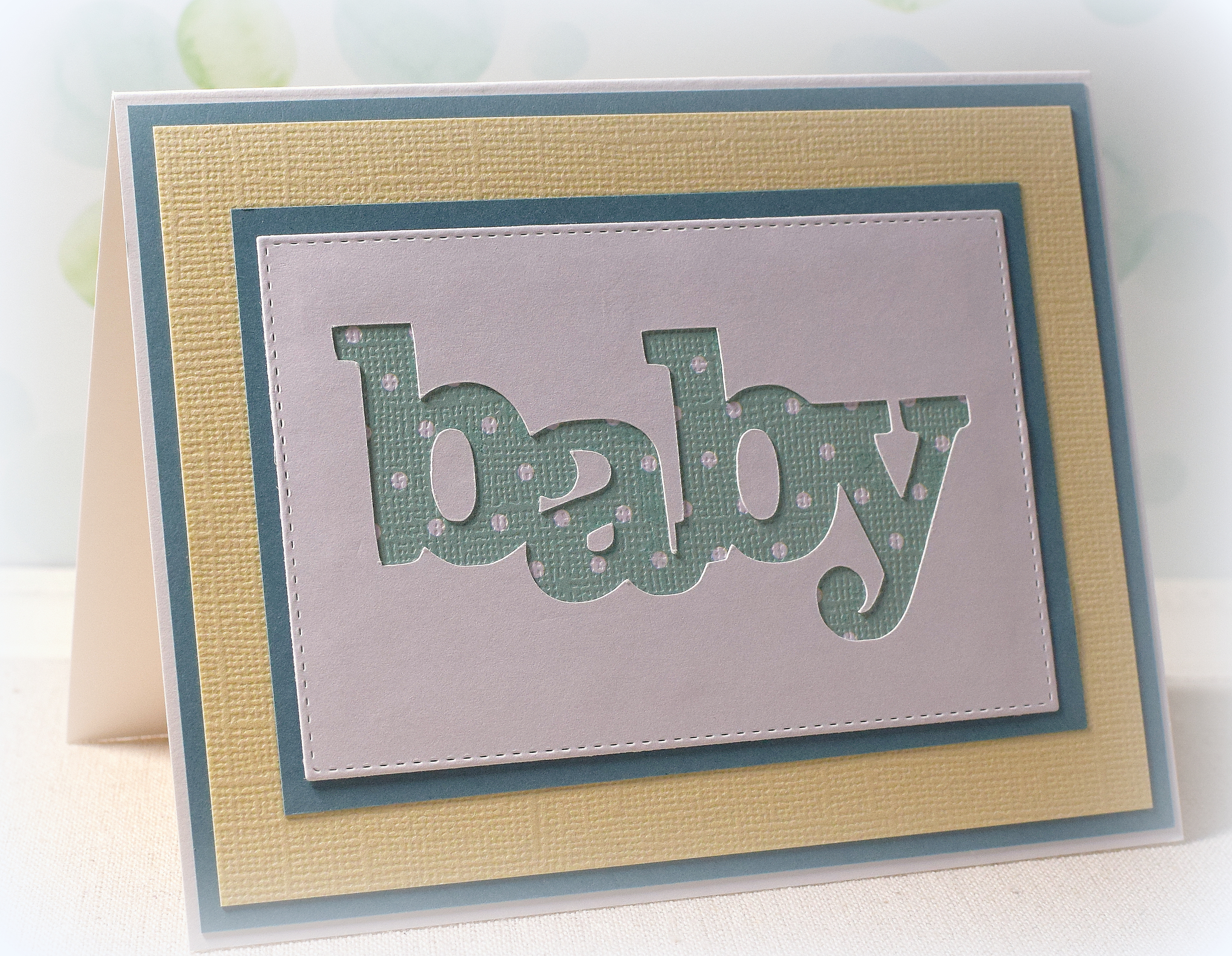 The greeting is from the “Bundle of Love” stamp set from Gina K Designs (retired?) and was stamped with “Mint Macaron” ink from Stampin’ Up. I’m not sure why my camera “sees” blues differently than I do; the ink and these papers match so much better in person than on the photo. (The papers are more greenish, and the ink is more bluish in real life.) Oh well!