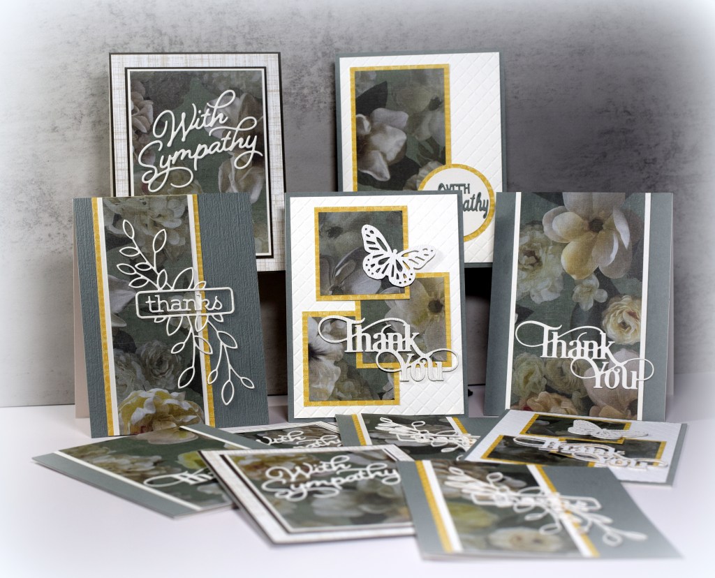 This was a fun project! There was not a drop of the patterned paper left over, and the simple sketches can be used on their own or with the template. And I have 11 cards ready to go!