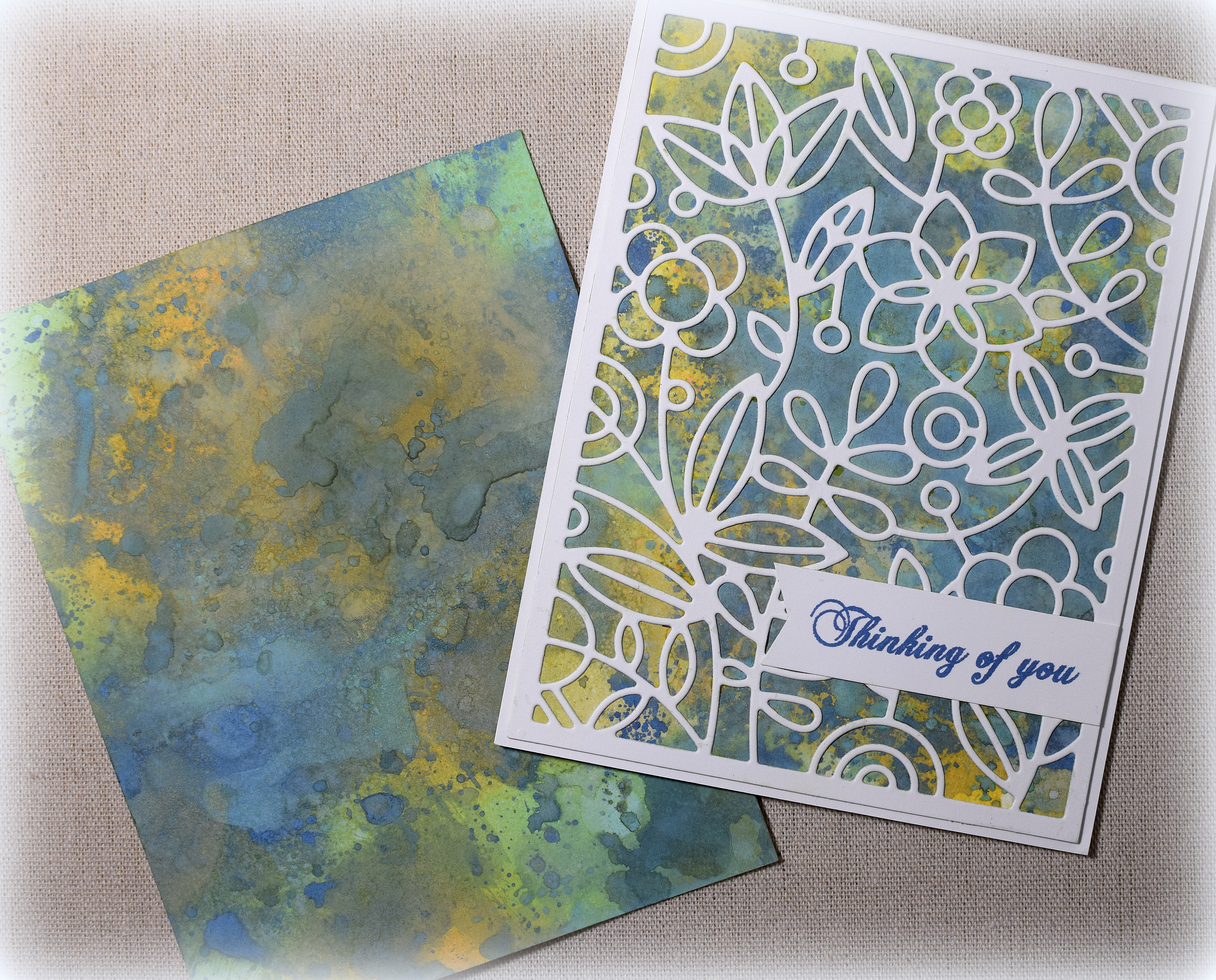 My original plan was to place the woven panel behind a cut-out window/frame as shown in the class, but the image was too large so I used the stitched frame die already sitting on my desk to create this next card…