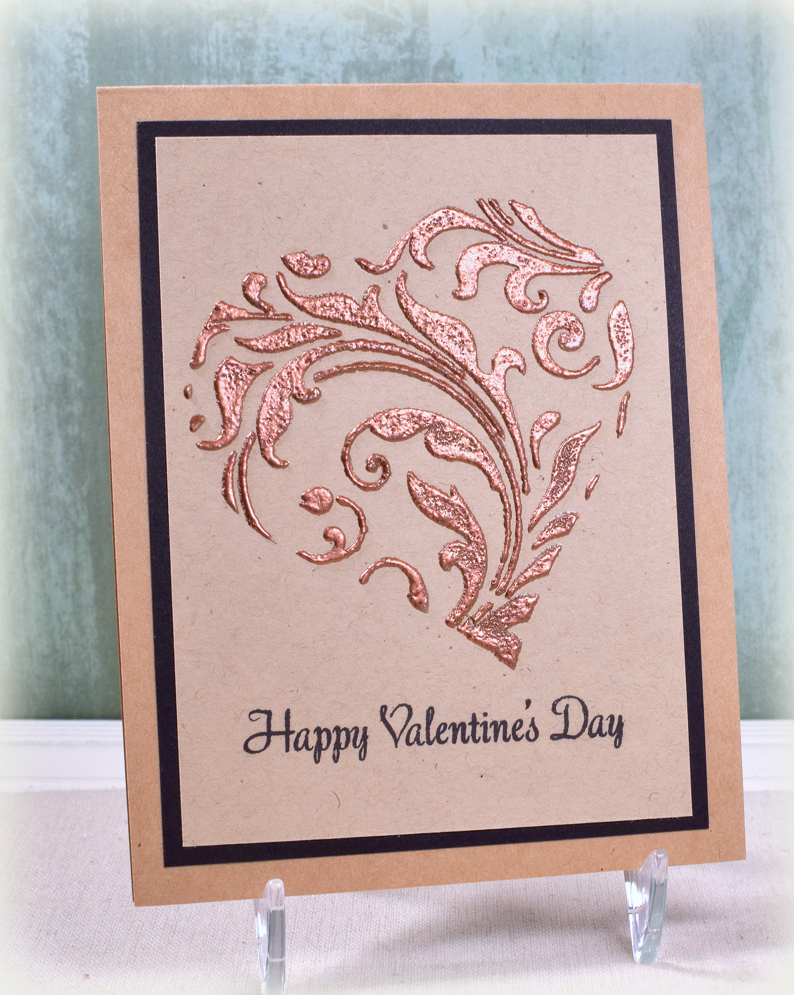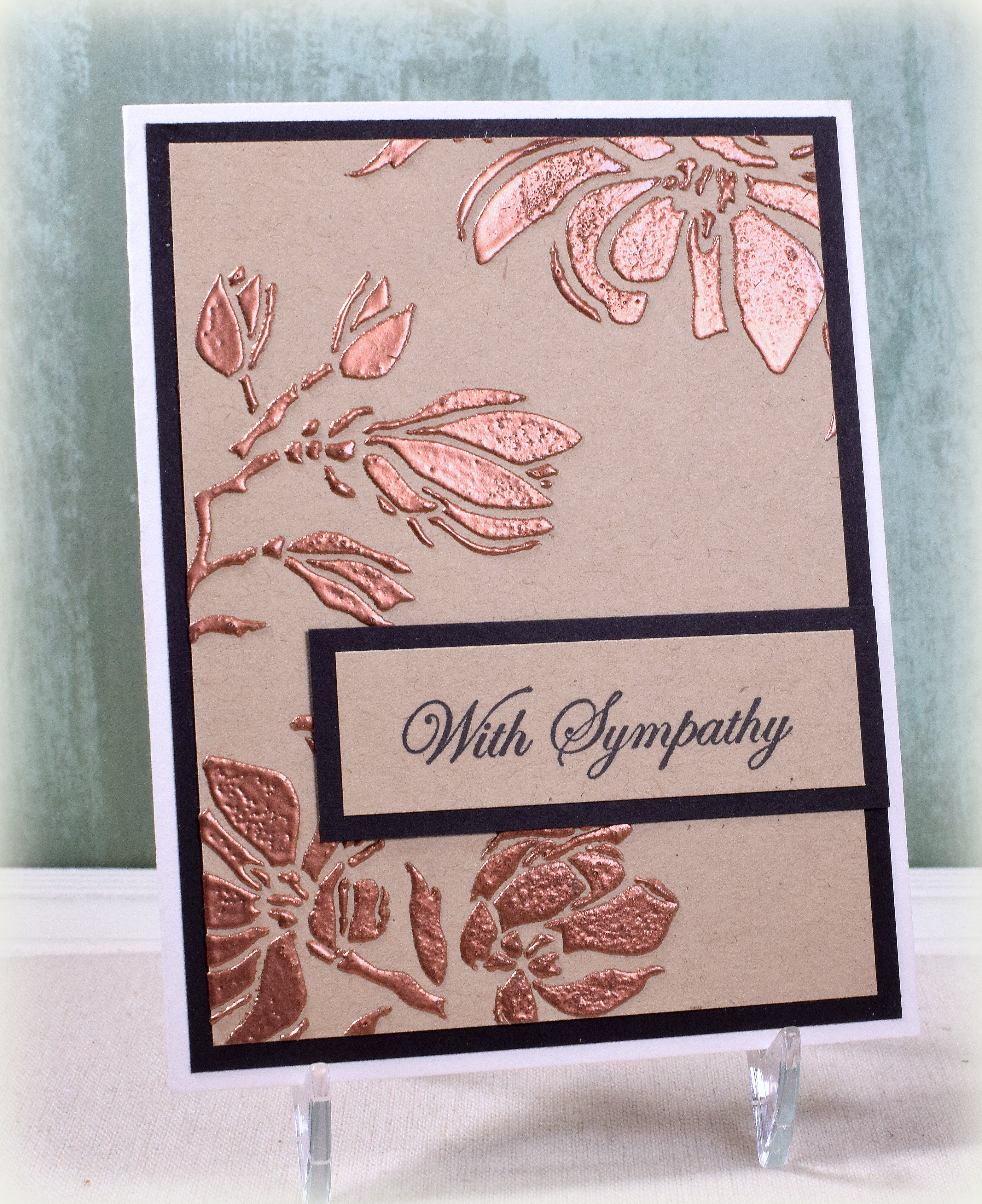 I stamped the same image onto a piece of ivory card stock with the Chocolate Truffle ink. Then I cut three frames with the frame die; the first was from the stamped panel, and two more were from Chocolate Truffle card stock. After stacking and gluing together the three die cut frames, I put the frames and the other parts of the cut, stamped panel back together on a Tranquil Teal card base. The greeting is from Gina K Design’s “Love & Prayers” set.