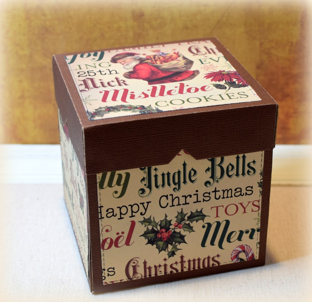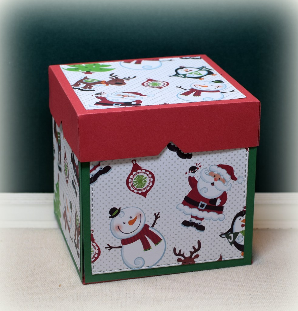 I used the CREAlies “Create A Box Large – Explosion (or not) box Large” die set (#CCABL27) to create the 3 3/4″ square box. For this one, I used red and green card stock along with card stock from several retired Recollections Christmas themed packs that I bought years ago.