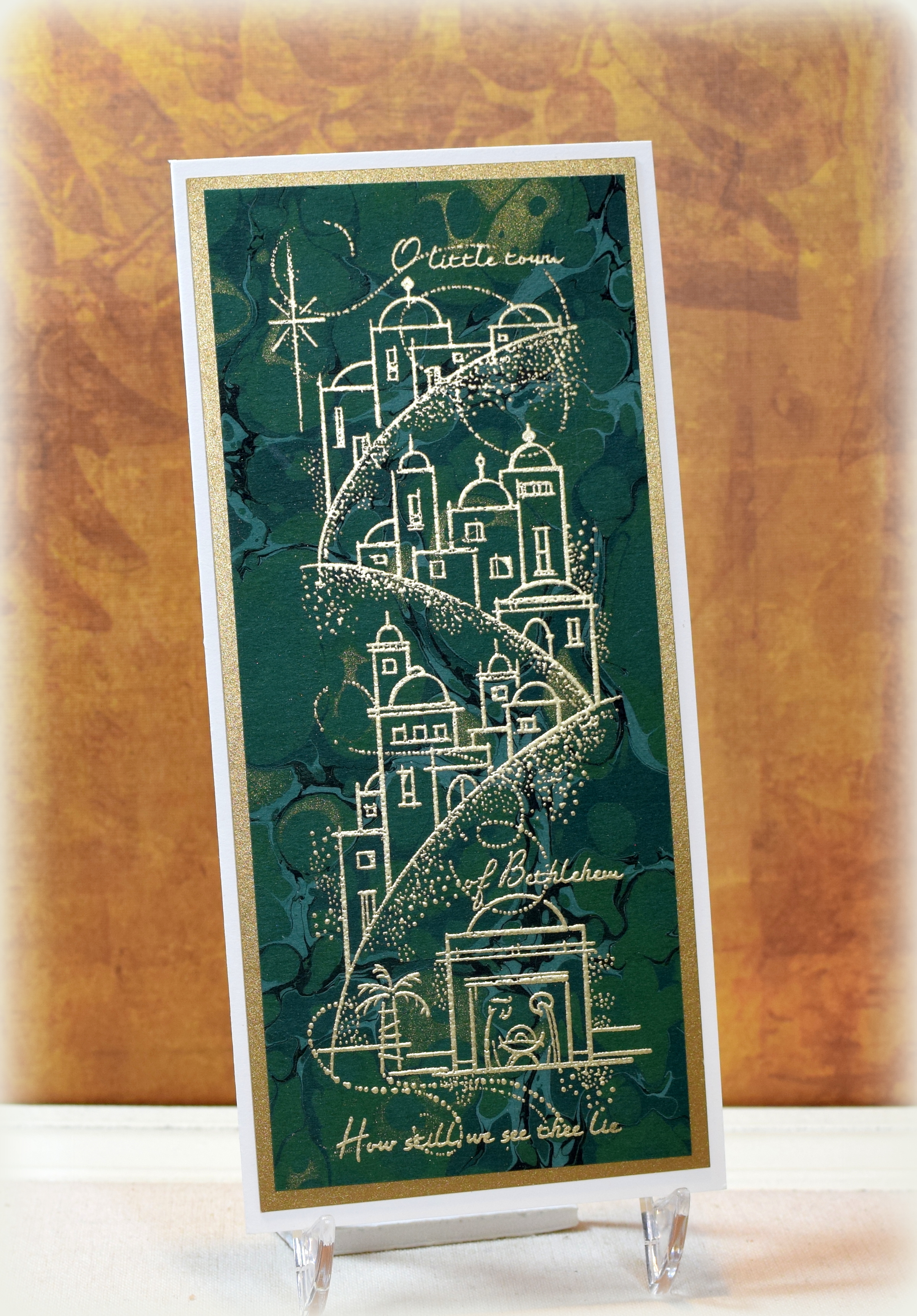 Back in July, I attended the Creating Keepsakes Scrapbook Convention in Lancaster, Pa, and I took a super fun class taught by Jennifer (from Stamplistic) where we played with Guilders Paste Wax. I love the metallic look achieved with this product and decided to use it to create the background for this Christmas card design.