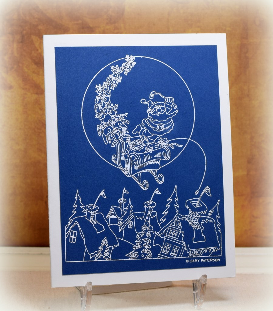 Someday, I’d like to sit down and color this image, but for now, white embossing powder on blue card stock makes a simple but fun card for golf enthusiasts! The stamp is called “Hole in One” by Gary Patterson/Stamps Happen.