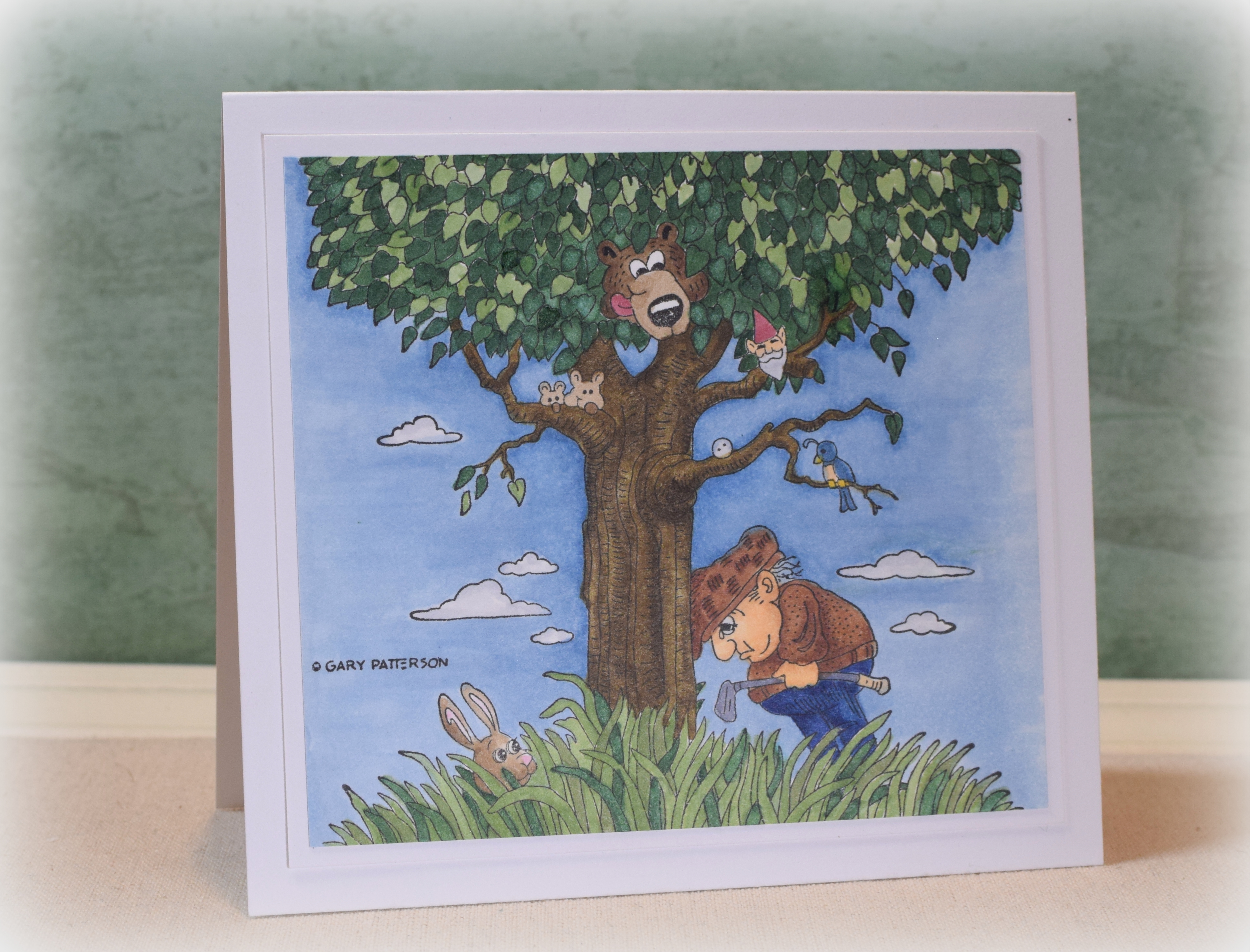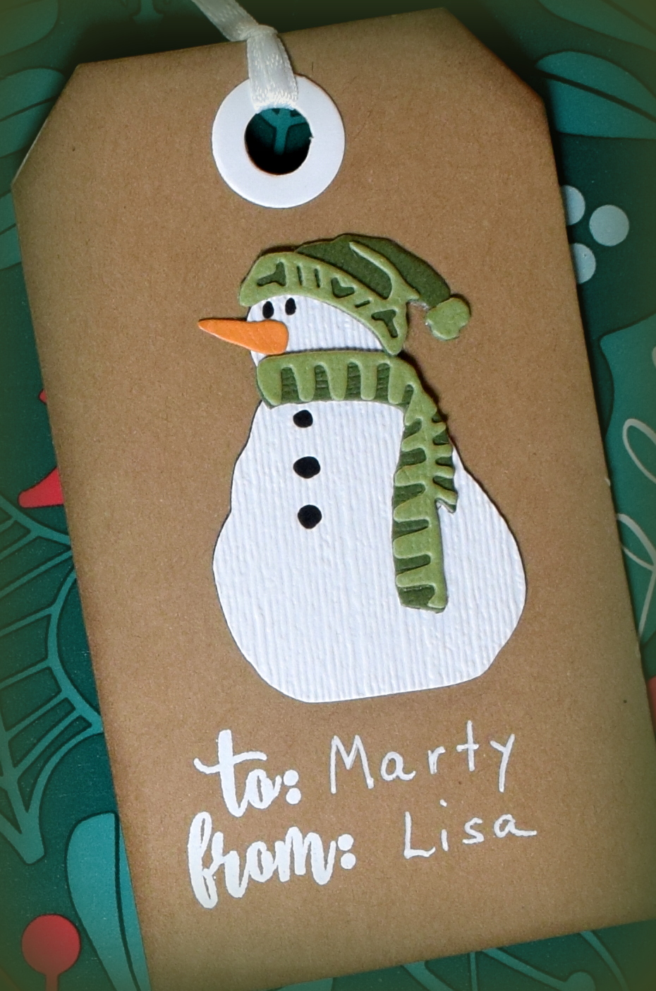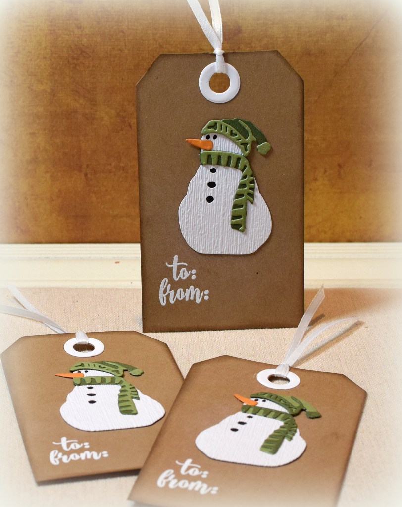 The background panel was debossed with the Darice “Snowflake Swirl” embossing folder. I used the debossed side so there’d be more surface area on which to adhere the die cut. The greeting was computer generated.