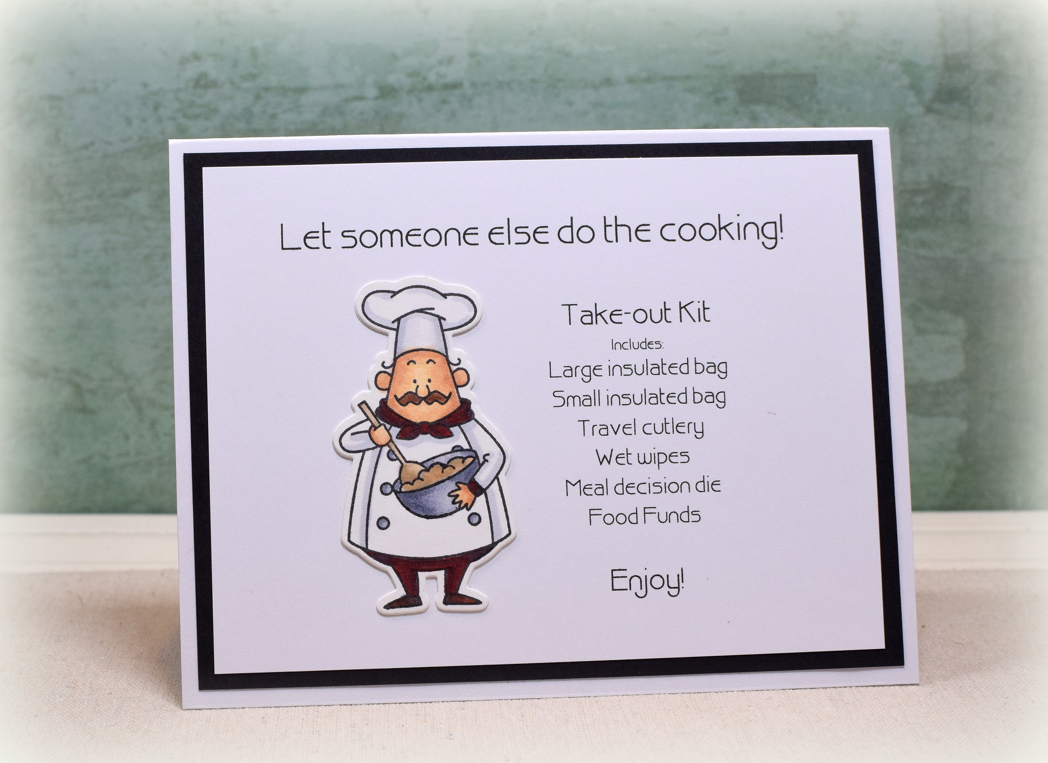My kids often opt for take-out instead of cooking for themselves (some more than others!), so I made “Take-out Kits” for each of them as part of their Christmas gift this year. This card was part of the the “kit.”