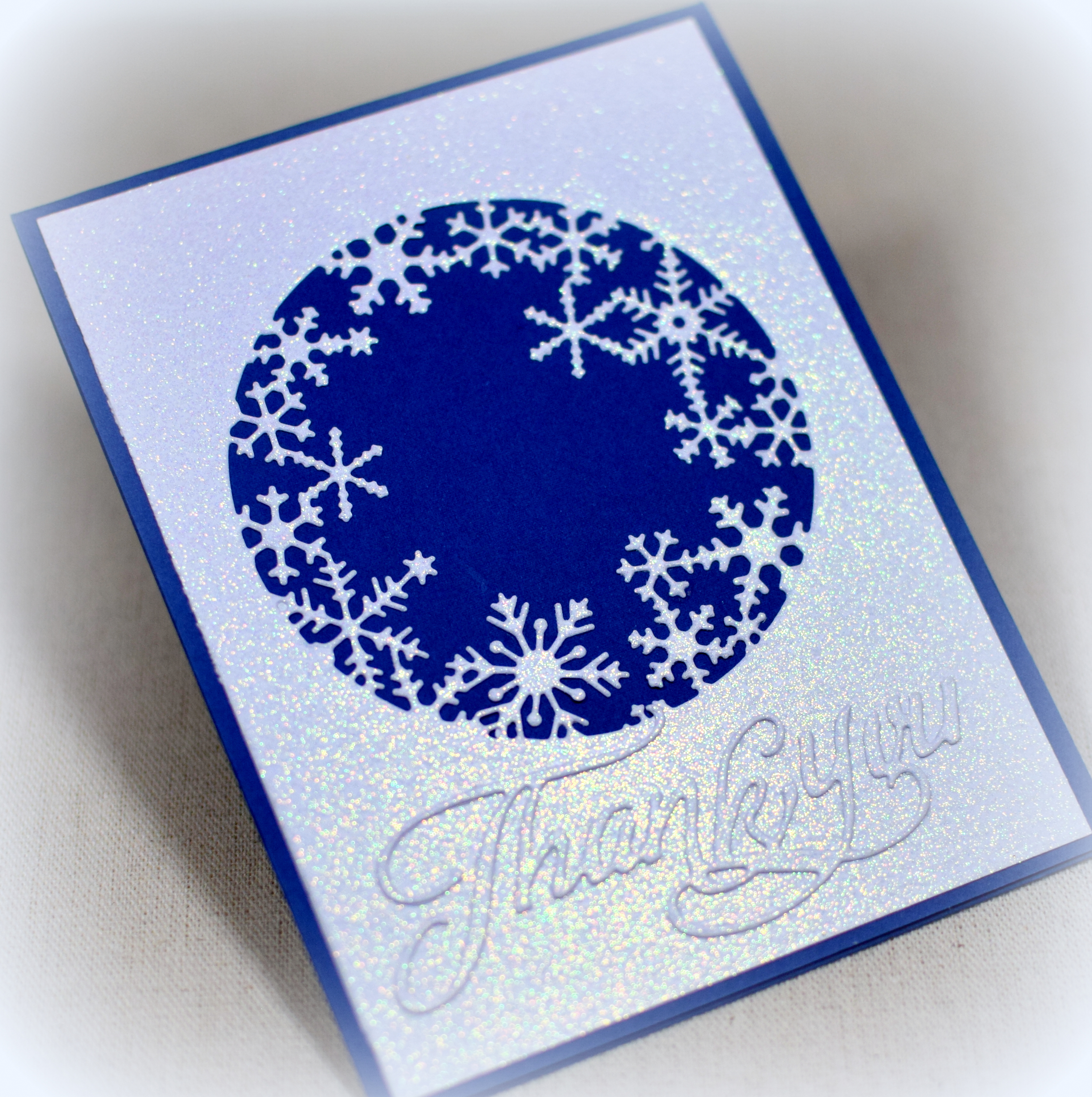 In addition to stamping/embossing the snowflakes in silver for the greeting panel, I repeatedly stamped/embossed the same snowflake (in white) to create a tone-on-tone background panel. (The card base is navy but looks black in the photo.)