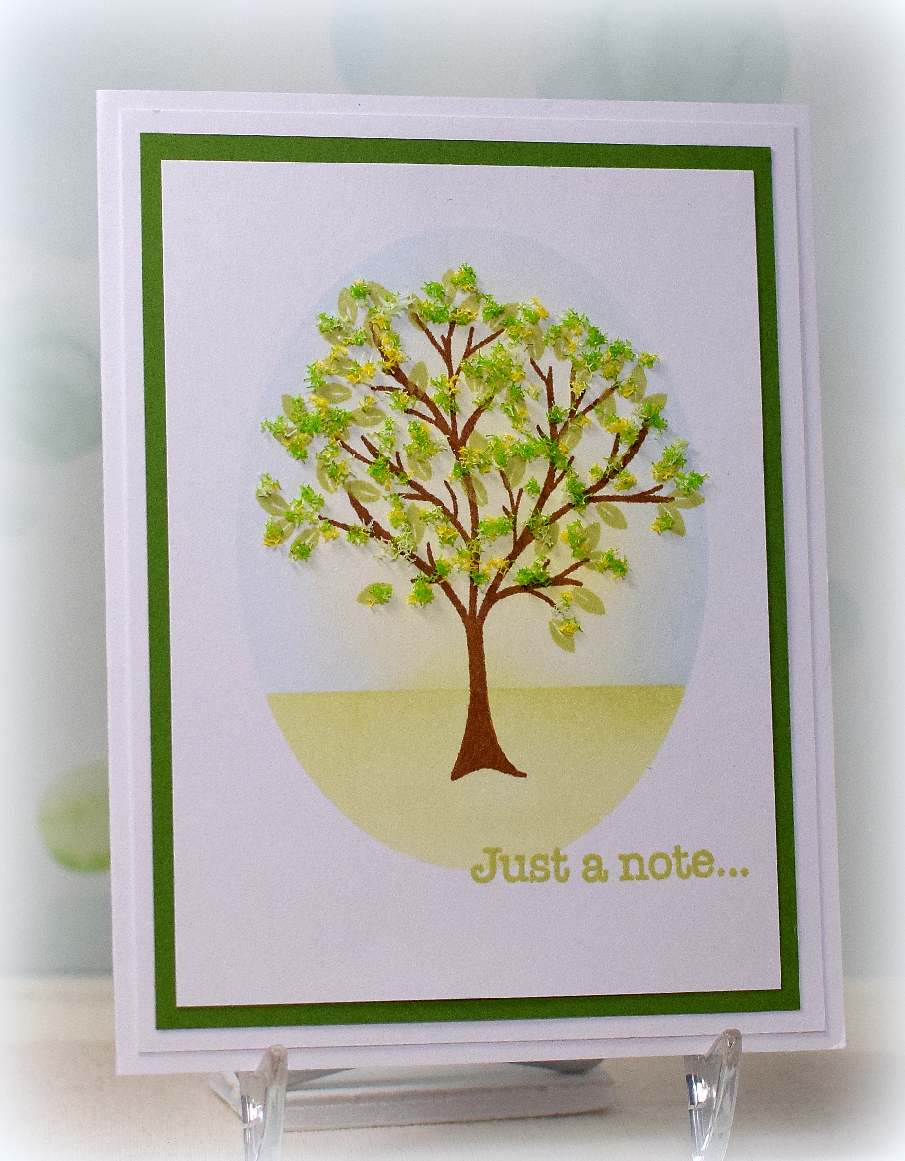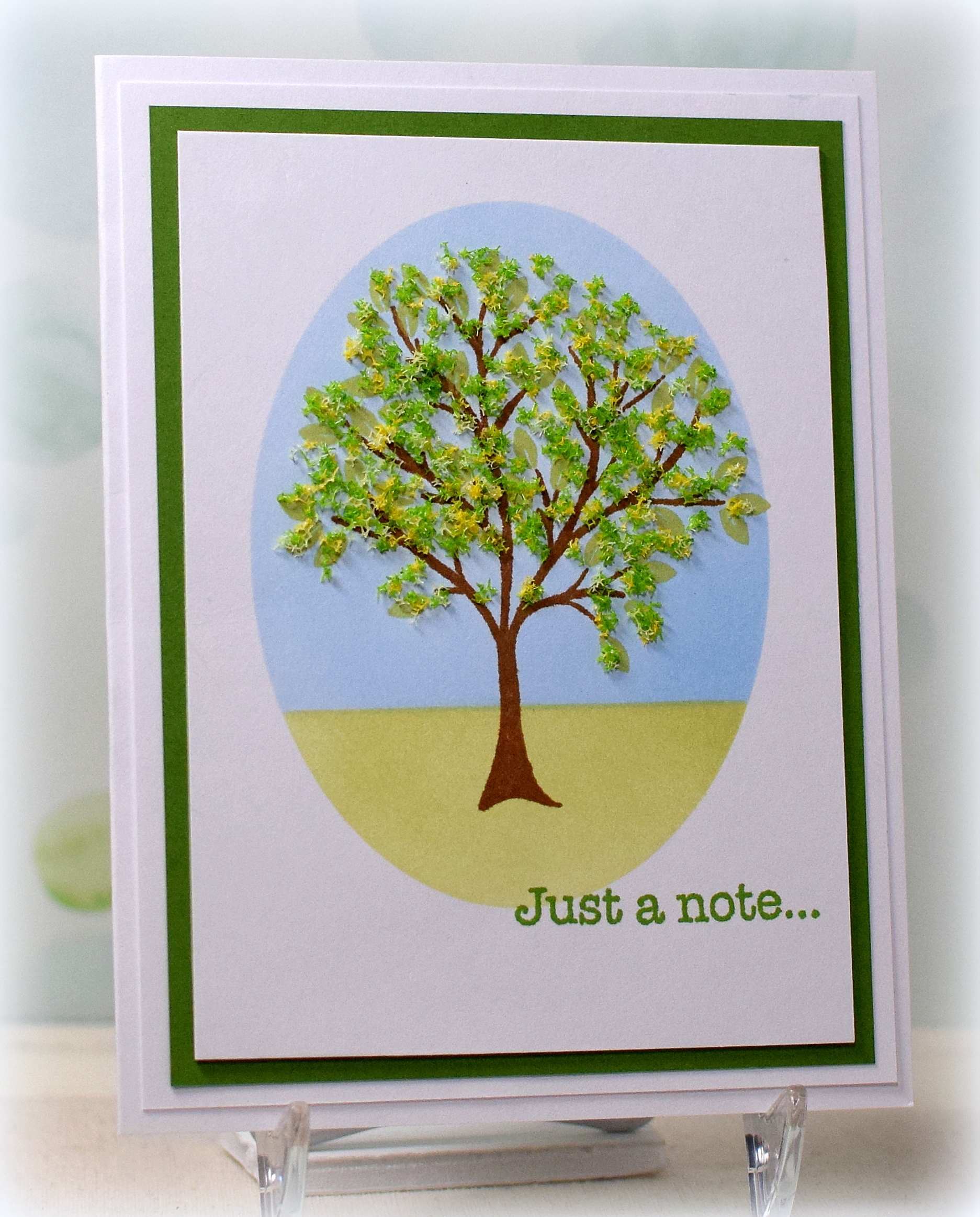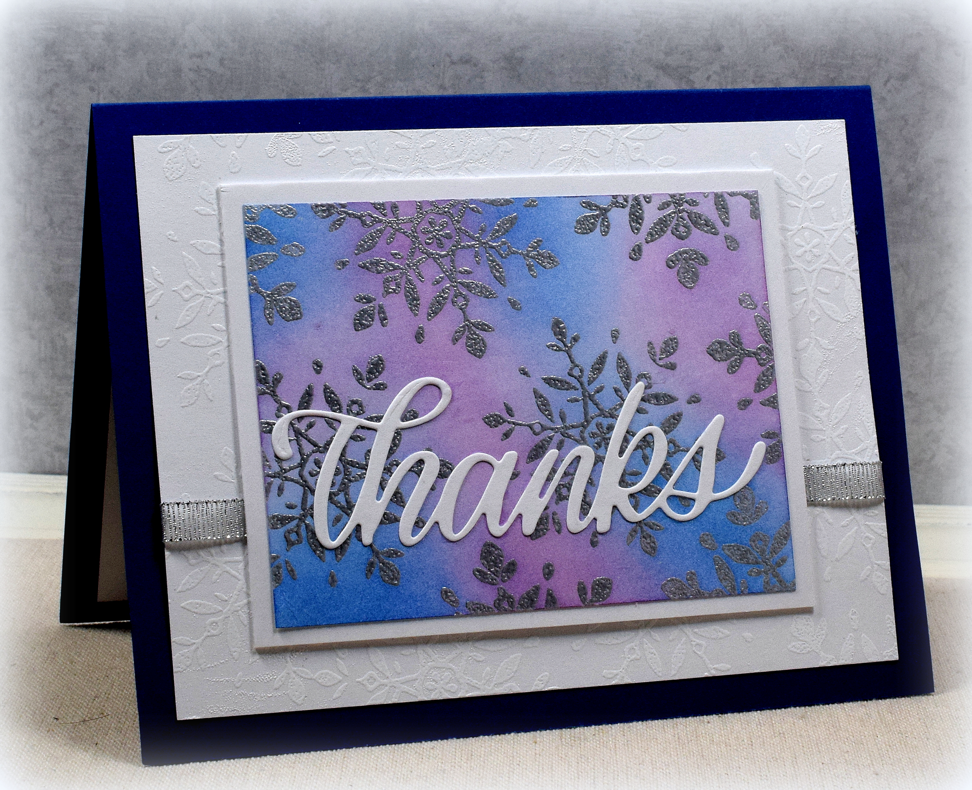 A die cut greeting was added to the sponged panel, and a silver ribbon finished it off.