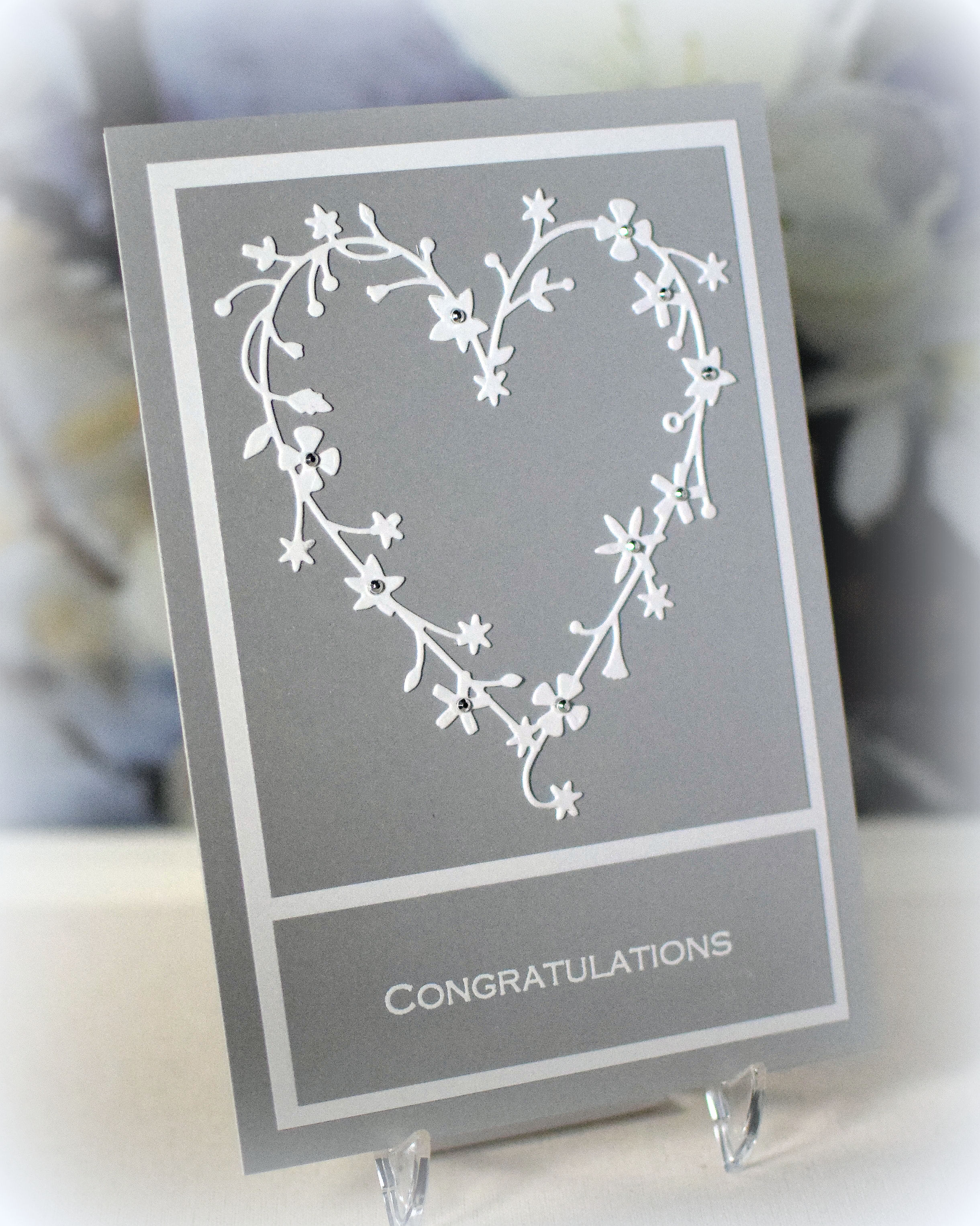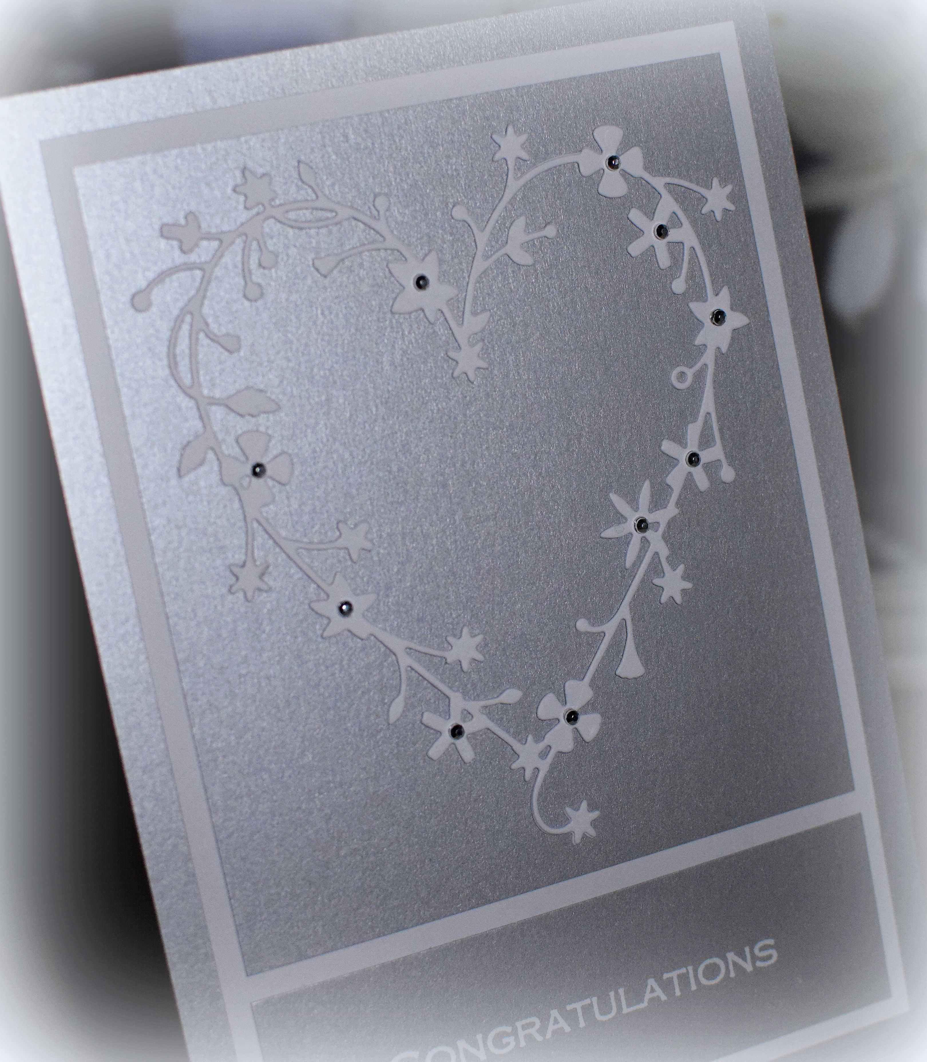 When I first sat down to make a wedding card, I knew I wanted to try a white on white, monochromatic card. I’ve tried this on several occasions in the past and always ended up adding another color. I was determined to stick with one color this time, and that’s about all that was left from my original idea for this initial version!