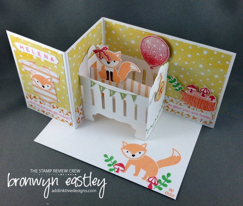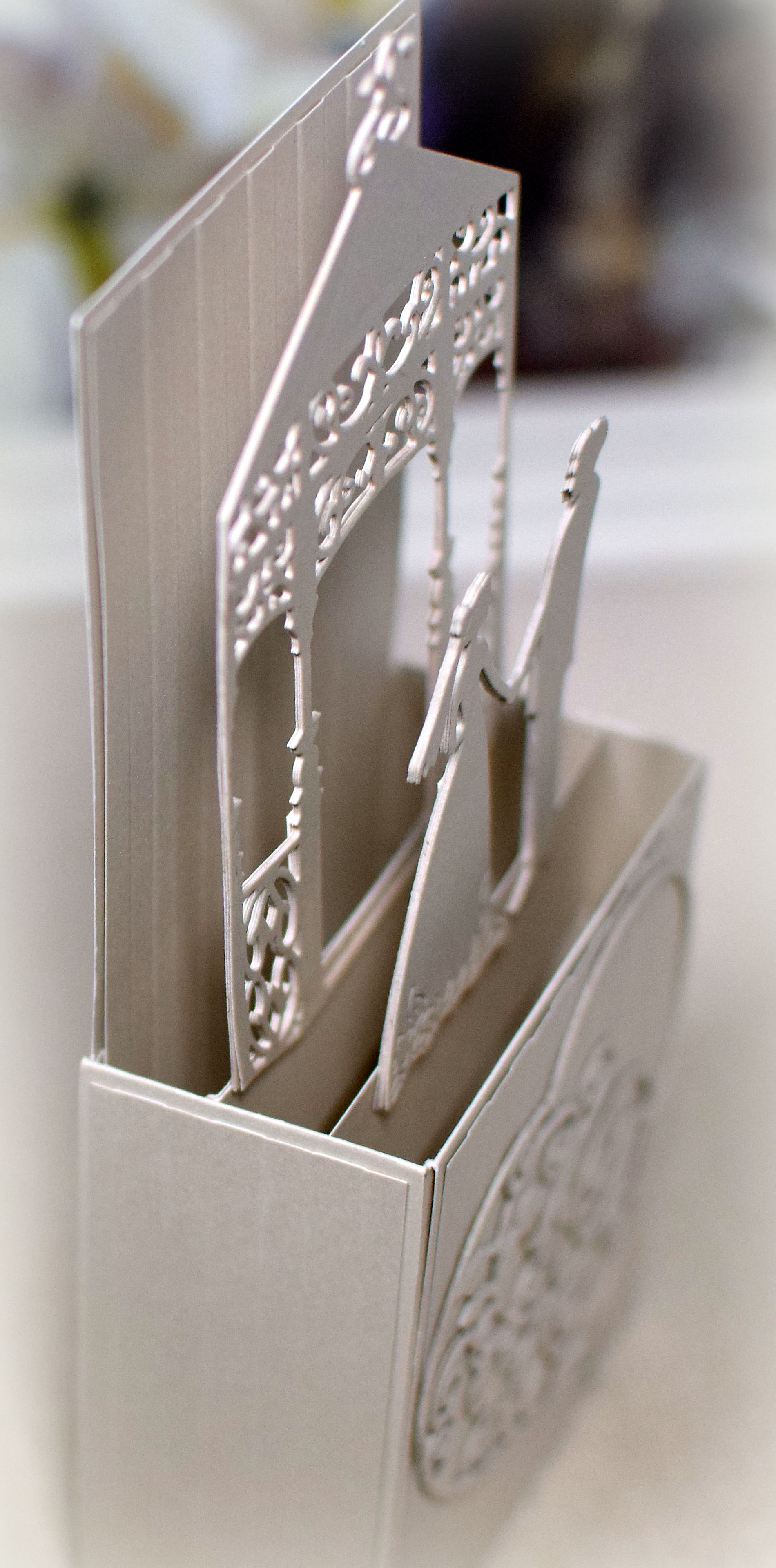 Isn’t it just the cutest?! Anyway, I created my pop-up mechanism (similar to the crib above with the three parallel panels but made with very short, plain strips instead) and attached the gazebo and the bride and groom die cuts to it. (I planned to use the heart on the front when the card was closed.) The problem was that I wanted my inner pop-up pieces to be completely hidden when my card was closed, and I just couldn’t figure out how to make that work with this z-fold type card base and the size of my pop-up structure.