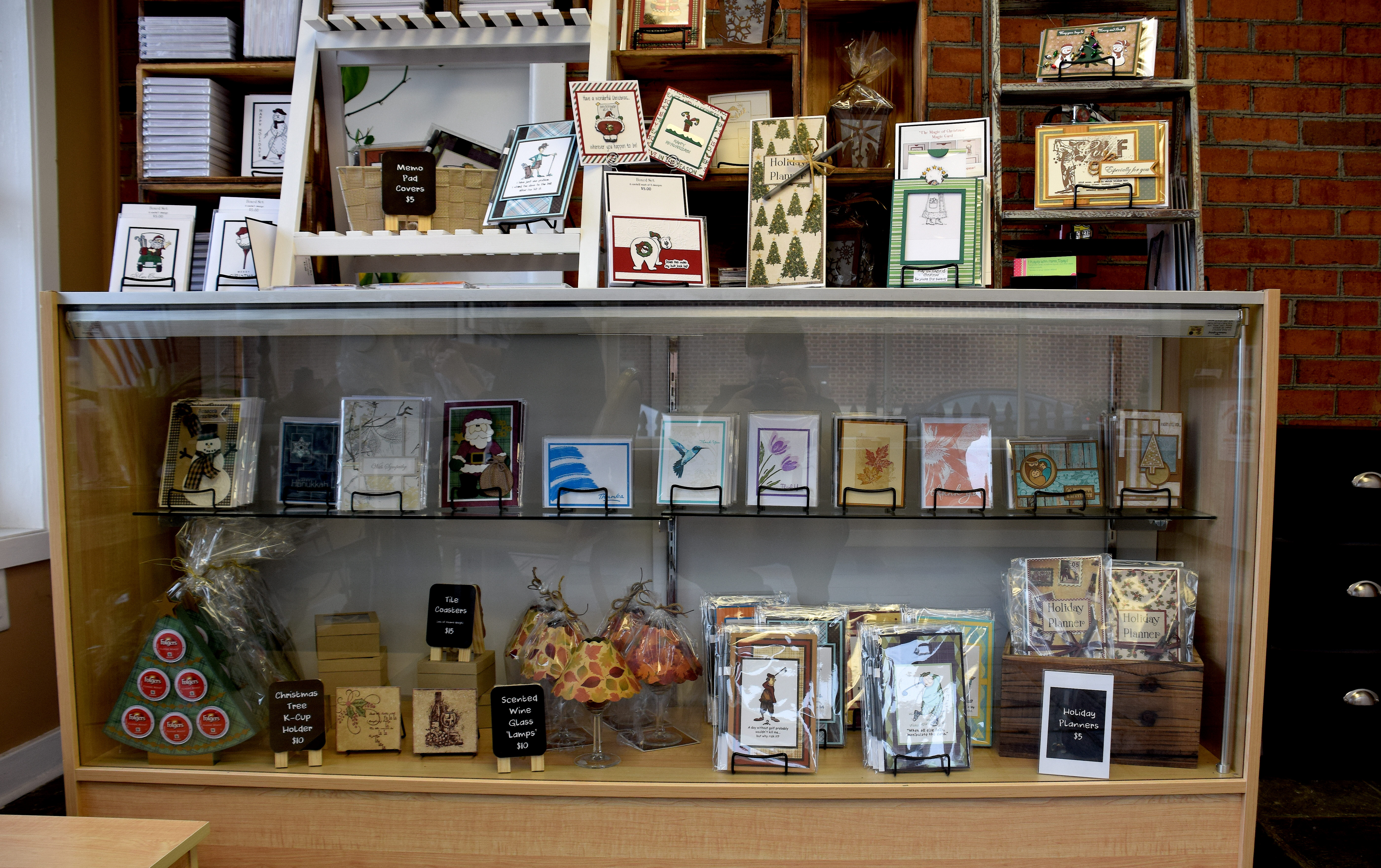 I figured people would more likely stop at my table if something caught their eye as they walked by and might not take the time to look through piles of cards in boxes. With this in mind, I had a limited number of designs I offered (shown below), and each card or project sample was displayed on a stand so people could walk by and easily see what I was selling. The duplicate cards and projects I actually sold were all packaged in clear sleeves or boxes. A table that measured 8 feet x 30 inches was provided, and that was all the space I had! It was crowded, but I got it all on there!! Boxes with additional inventory were stored under the table or on the window sill behind the table.