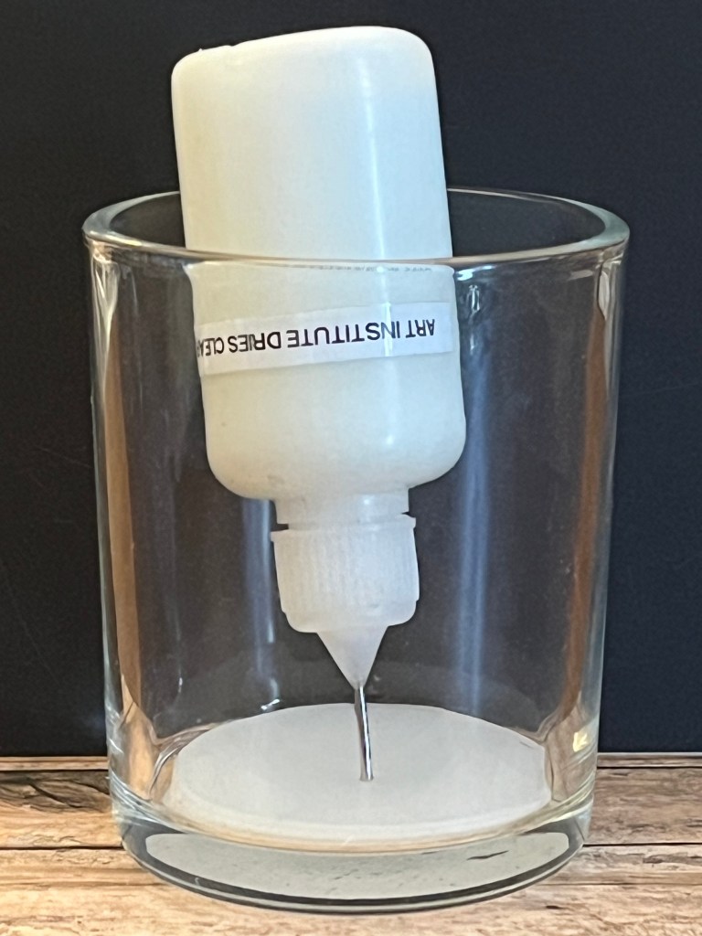 I love the fine metal tips available for many of the glue bottles on the market today, but I hate that mine always seems to be clogged when I start a project even when a pin is used to seal the bottle when not in use. I even tried using an airtight glass jar in which to store it with no luck. (I use Art Institute Dries Clear Glue in a small refillable squeeze bottle.) I noticed that the glue bottle in the My Sweet Petunia Precision Glue Press is stored uncapped and upside down on a piece of silicone. I also saw Karen Burniston’s video (1:49) where she suggests to store glue bottles with the precision tips upside down in a jar with a damp paper towel on the bottom. The challenge with this (for me) is making sure the paper towel is always wet. But I used the 2 ideas which seems to have solved my clogging (and sealing) problem! My glue bottle now sits in a small glass cup with a piece of silicone on the bottom. It is always ready to use (not clogged), and I don’t have to stick a pin in it when I am not using it. Game changer!!