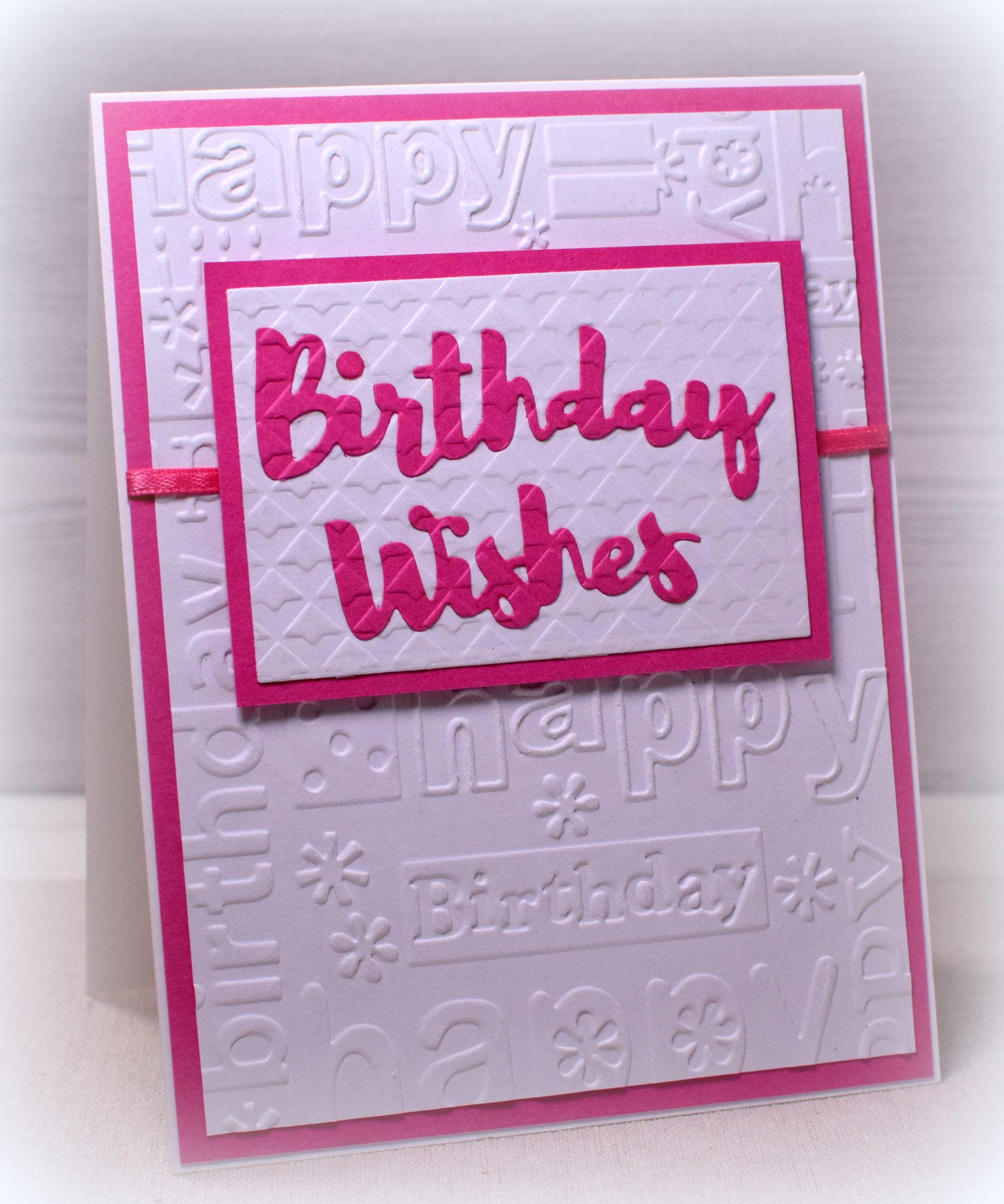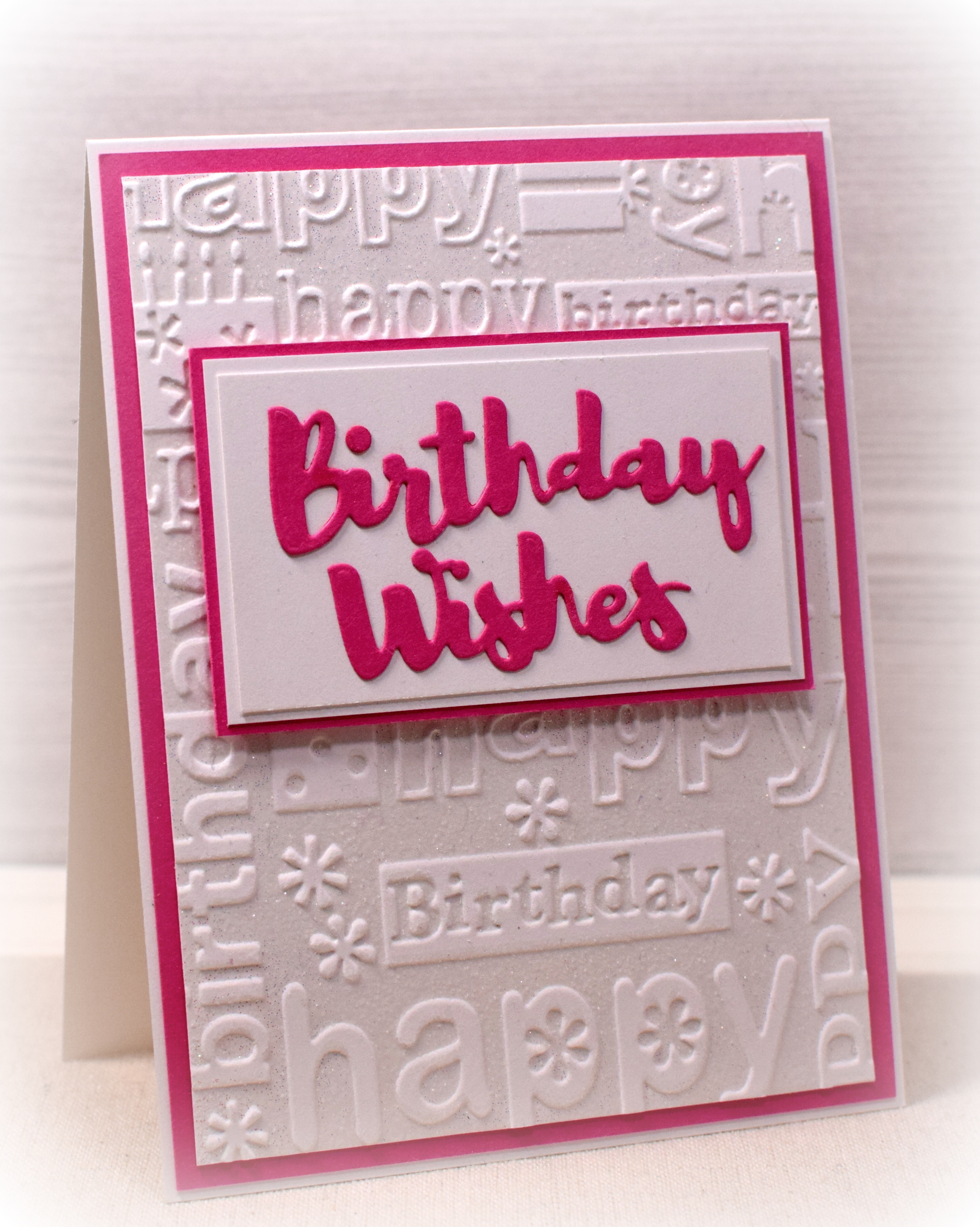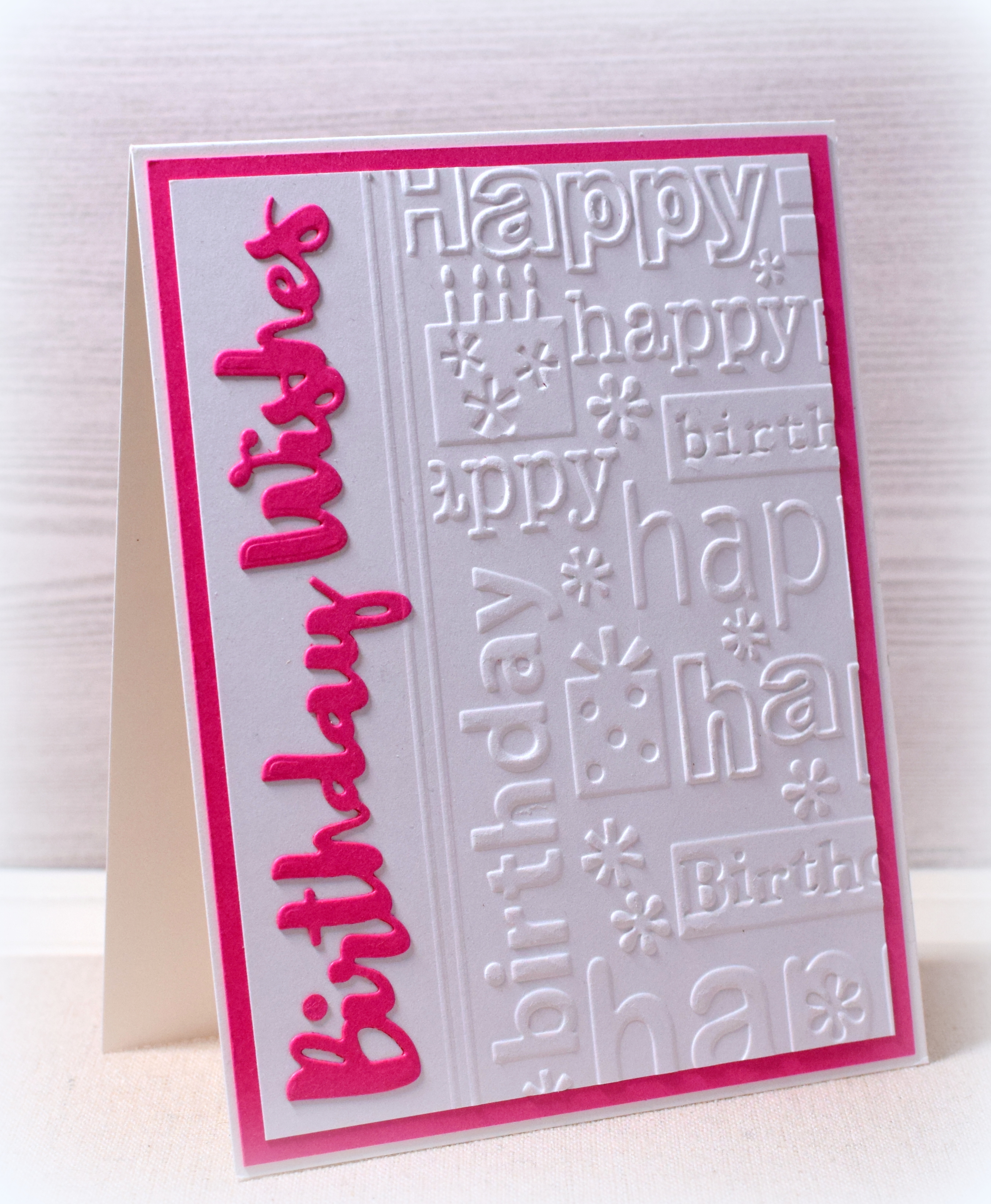 After my aunt passed away a year and a half ago, I was fortunate enough to receive all of the stuff from her “Cuttlebug Station” from her craft room. The “Birthday Wishes” die set and “Happy Birthday” embossing folder were hers, and I really enjoyed using tools that she had also used. Recently, I spent a fun afternoon searching online for the names of all the unmarked dies and embossing folders from her stash which led me to tons of card samples and tutorials that I am anxious to try. She continues to inspire me even though she is no longer here!