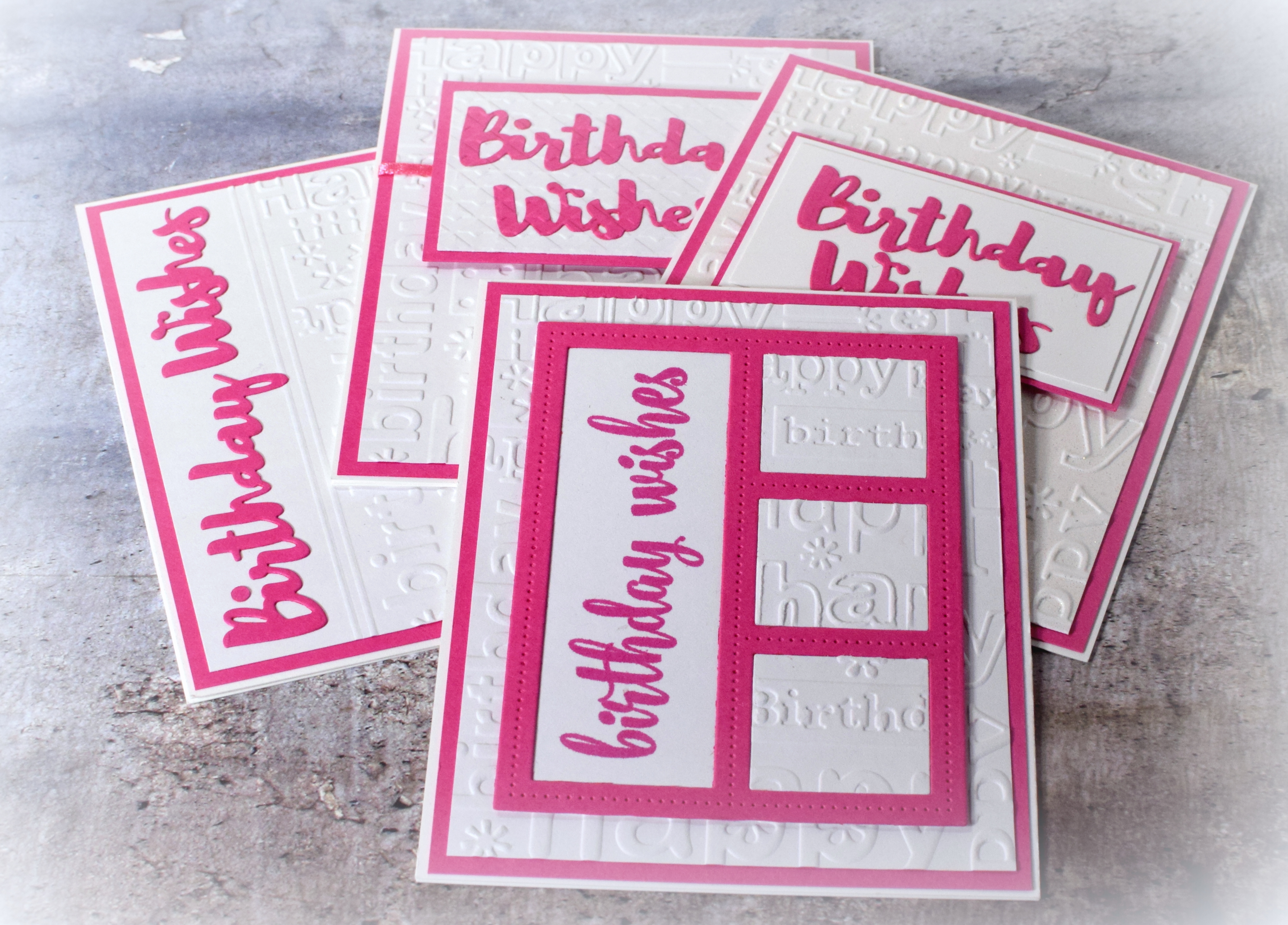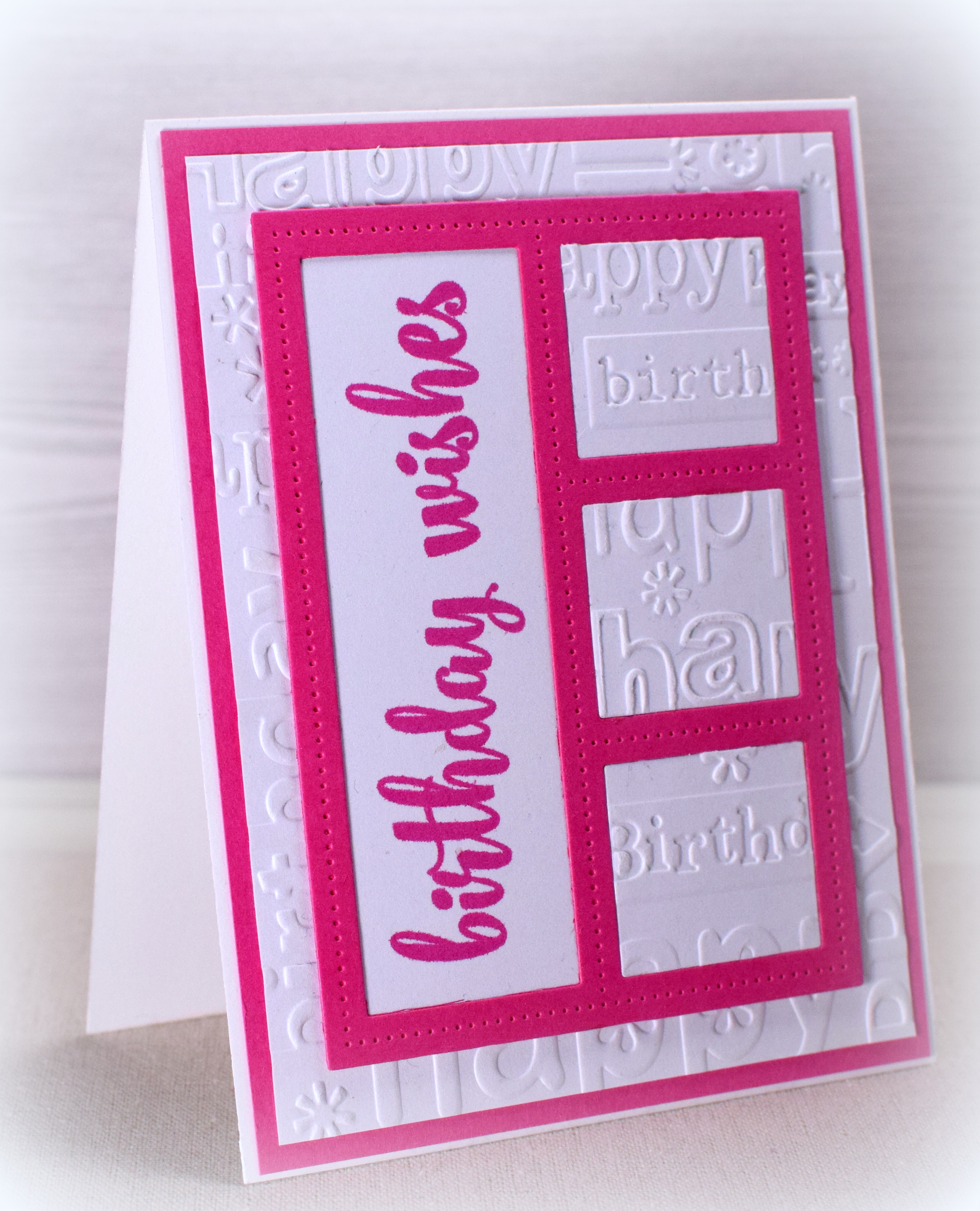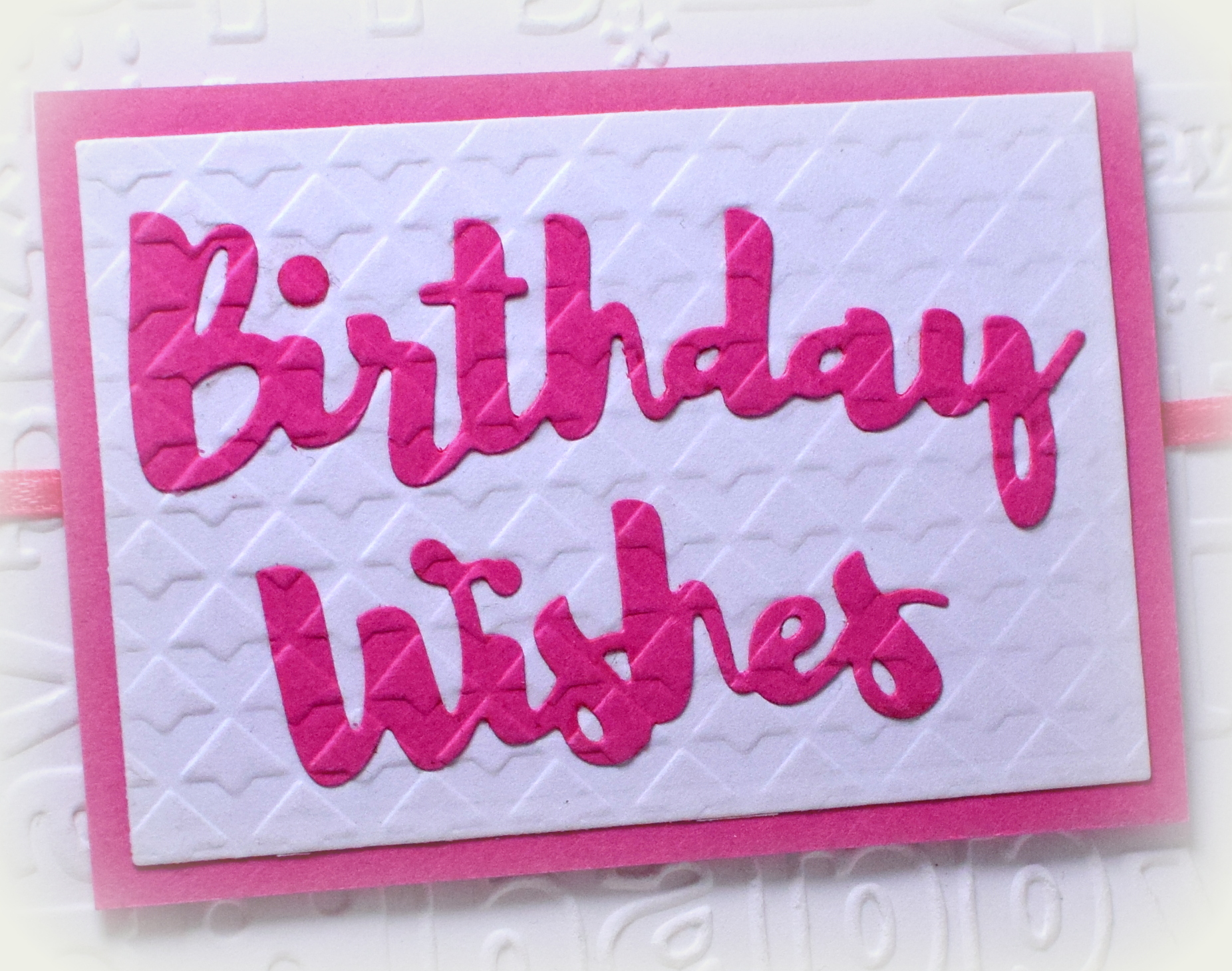 After my aunt passed away a year and a half ago, I was fortunate enough to receive all of the stuff from her “Cuttlebug Station” from her craft room. The “Birthday Wishes” die set and “Happy Birthday” embossing folder were hers, and I really enjoyed using tools that she had also used. Recently, I spent a fun afternoon searching online for the names of all the unmarked dies and embossing folders from her stash which led me to tons of card samples and tutorials that I am anxious to try. She continues to inspire me even though she is no longer here!