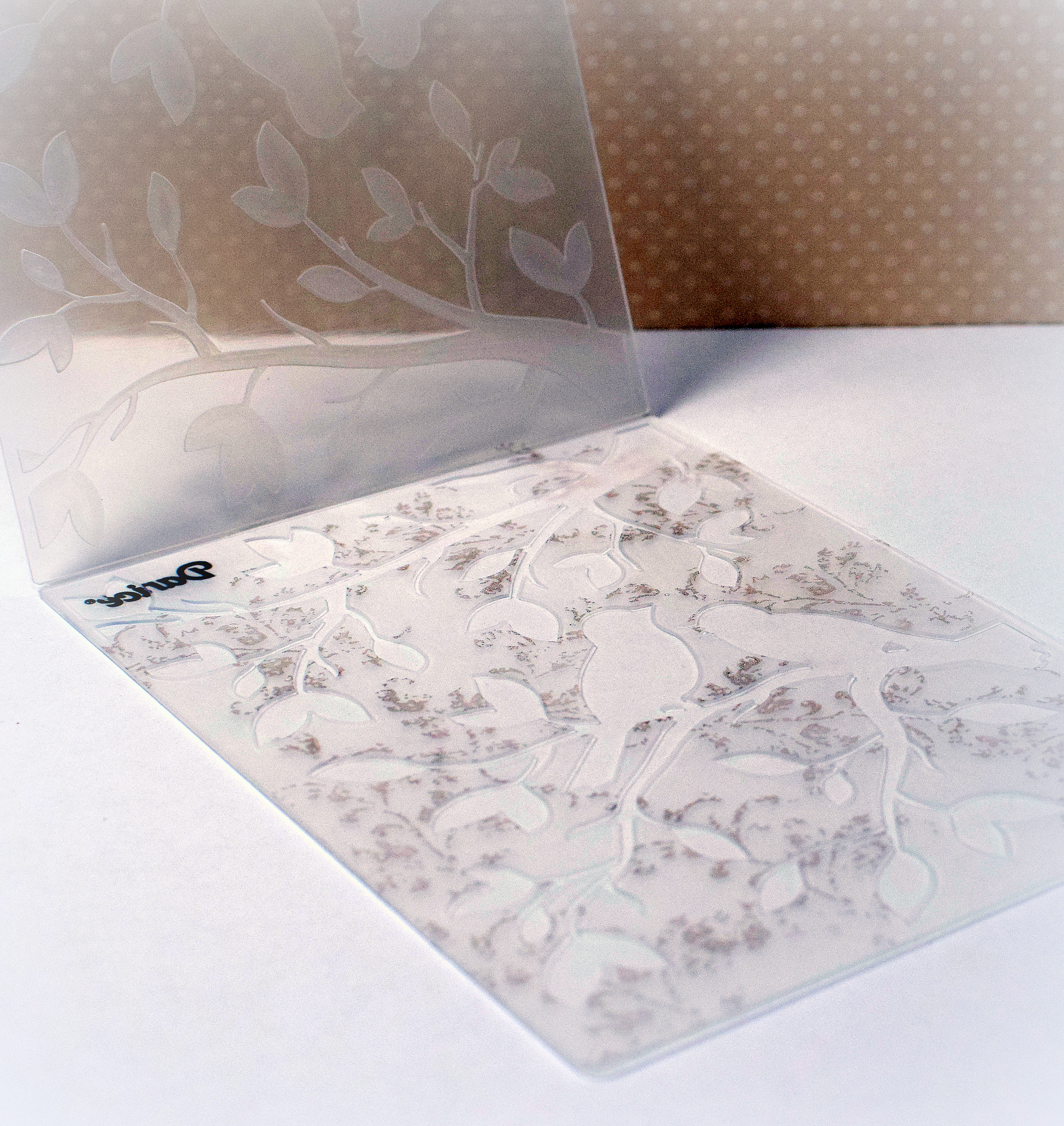 In order to make the stamped pattern appear behind the embossed birds and branches, you stamp the pattern onto the inside of the embossing folder before embossing. Embossing folders with larger, solid portions (as opposed to thin lines/patterns) work best for this technique. Open the embossing folder and stamp your image on the “front” side of the folder (with the indented images that will be embossed). You want the ink/stamped images to go only on the flat part of the folder; avoid getting ink inside the “indented” birds and branches. (In other words, press/stamp lightly; do not press so hard on your stamp that it squishes into the indented portions of the folder.) You can use a large background stamp to ink up the folder or repeatedly stamp a smaller image (like I did here). Keep in mind that whatever you stamp will transfer as a mirror image so text, music notes, etc. will appear backwards with this technique.
