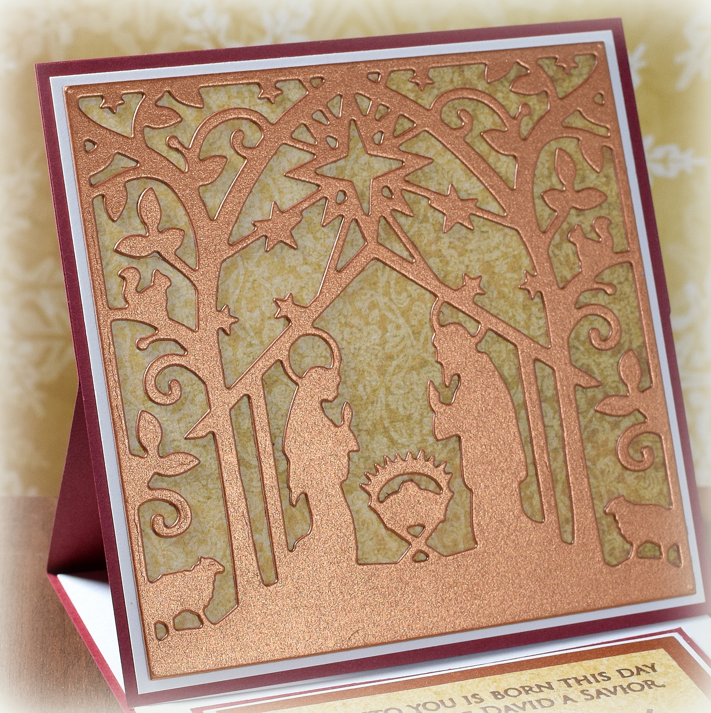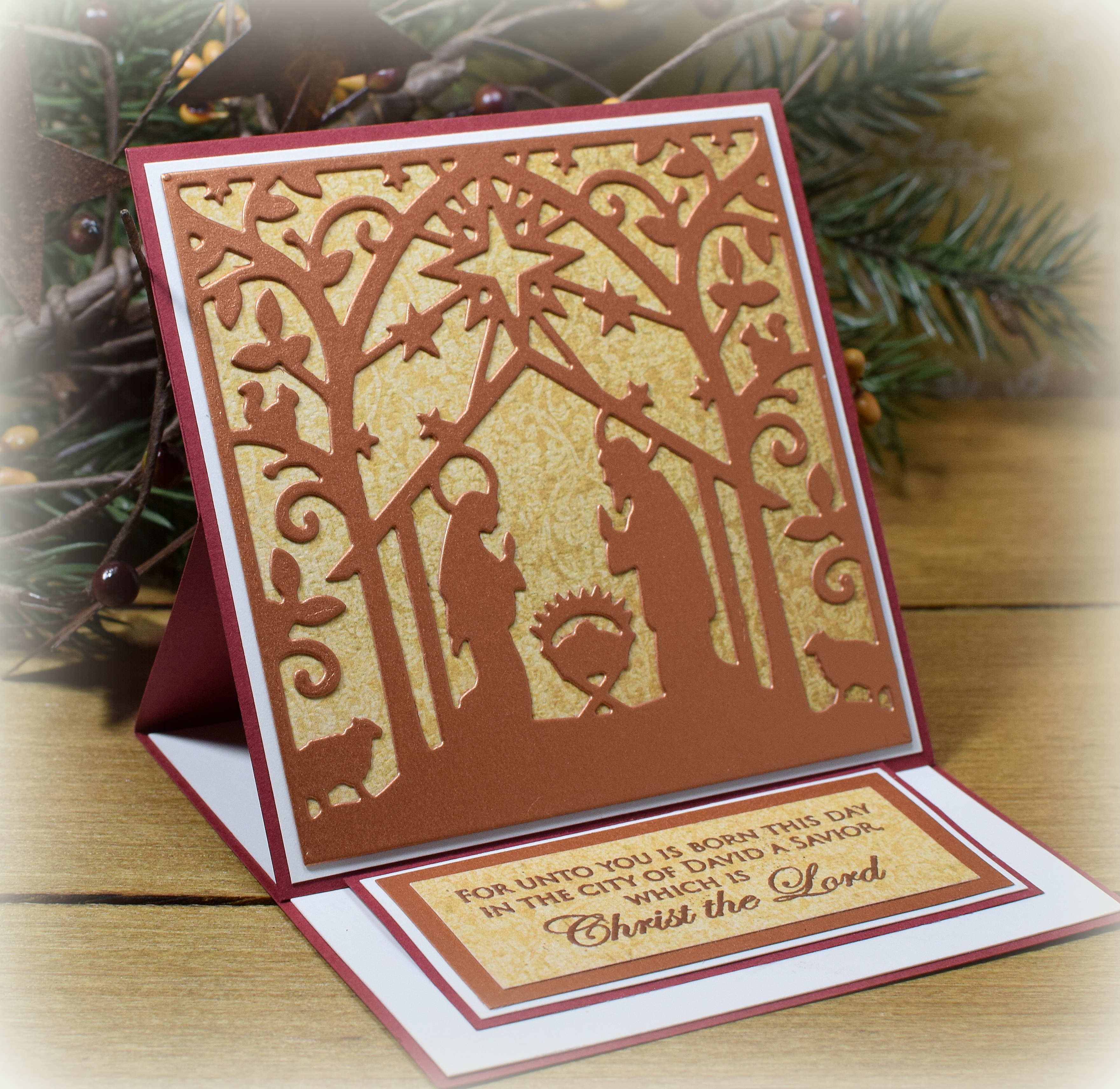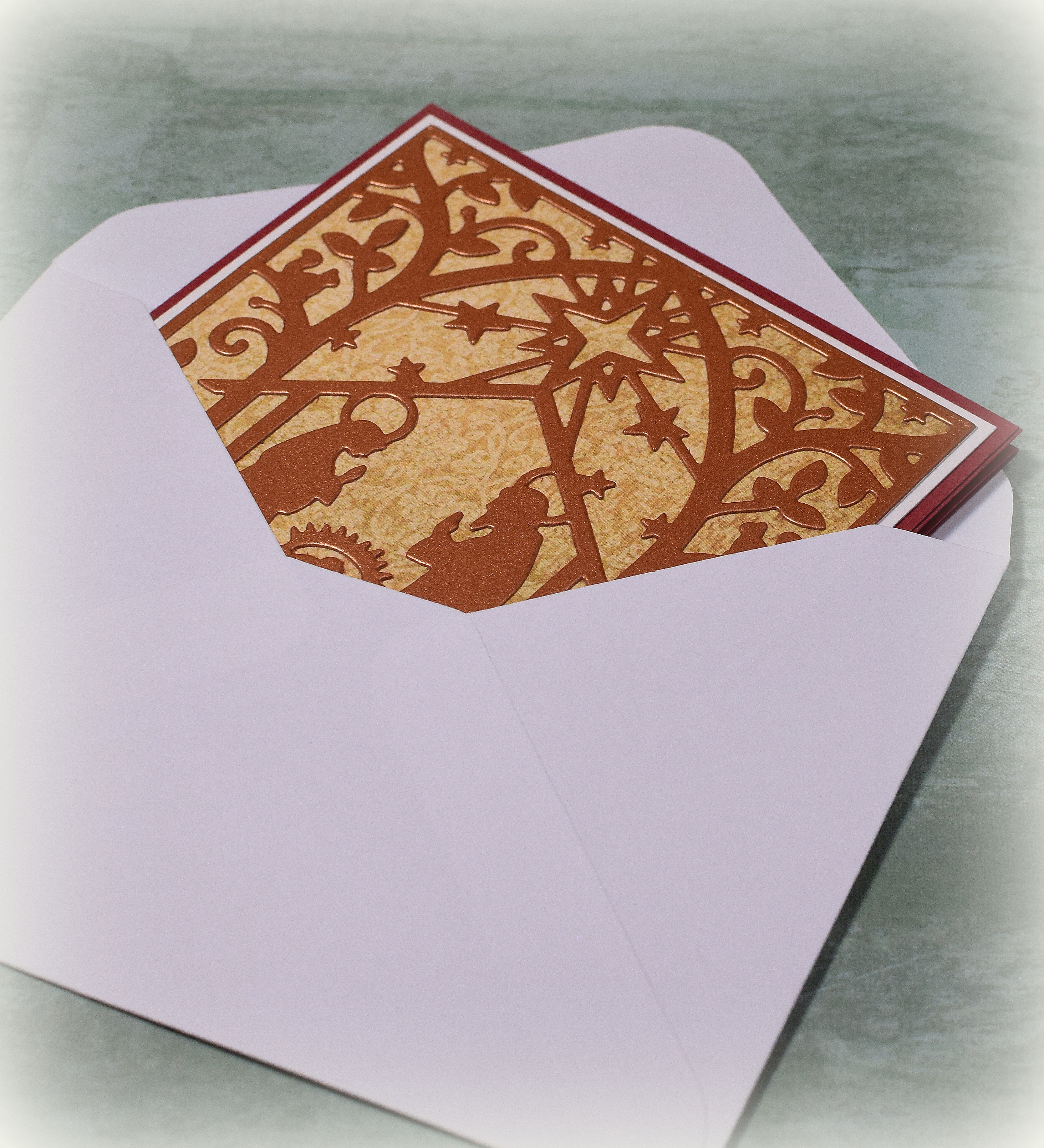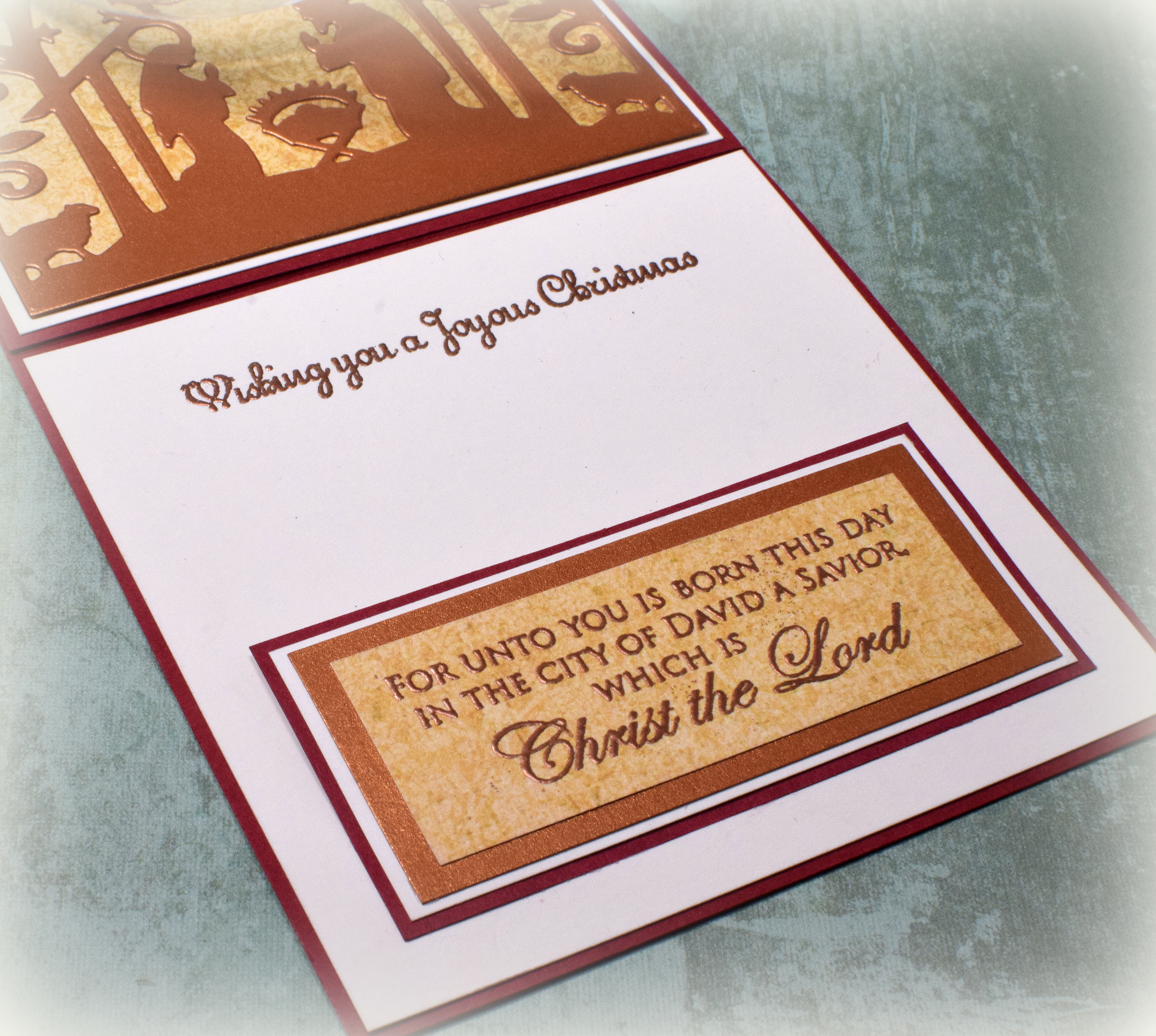 The mat is “Copper” card stock from Cardstock Warehouse’s Starstream Collection with an ivory card base. The Merry Christmas stamp is from the “Sentimental Holidays” set (retired?) from Gina K Designs.